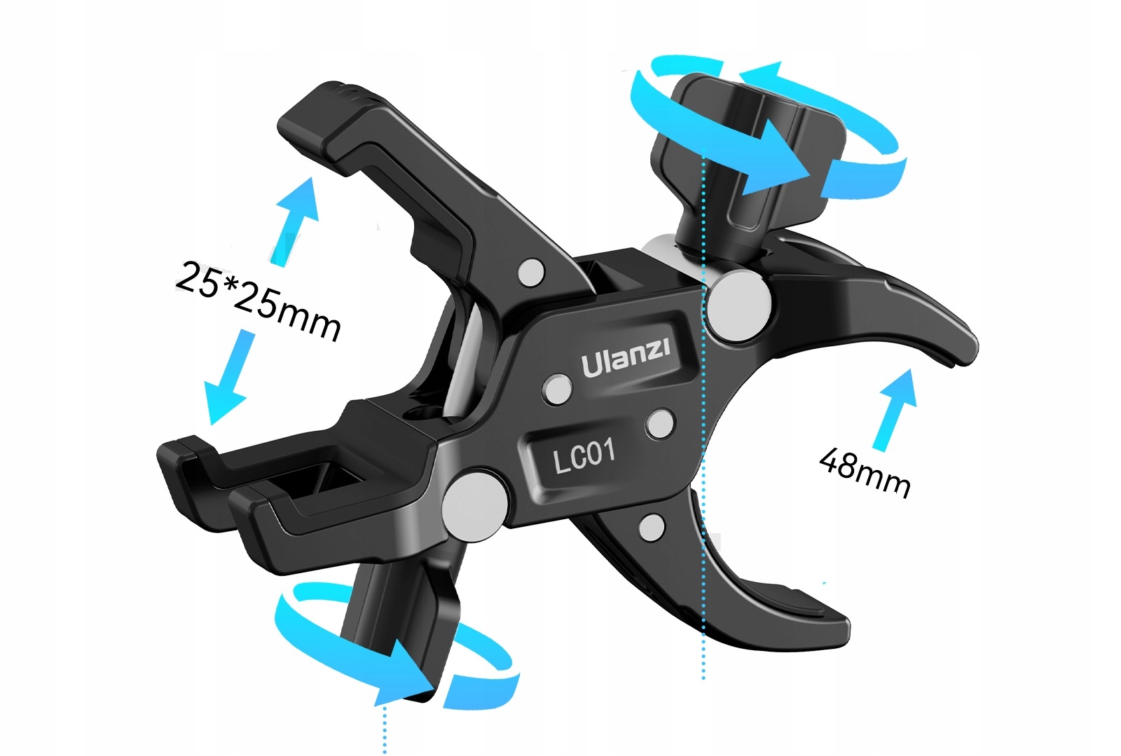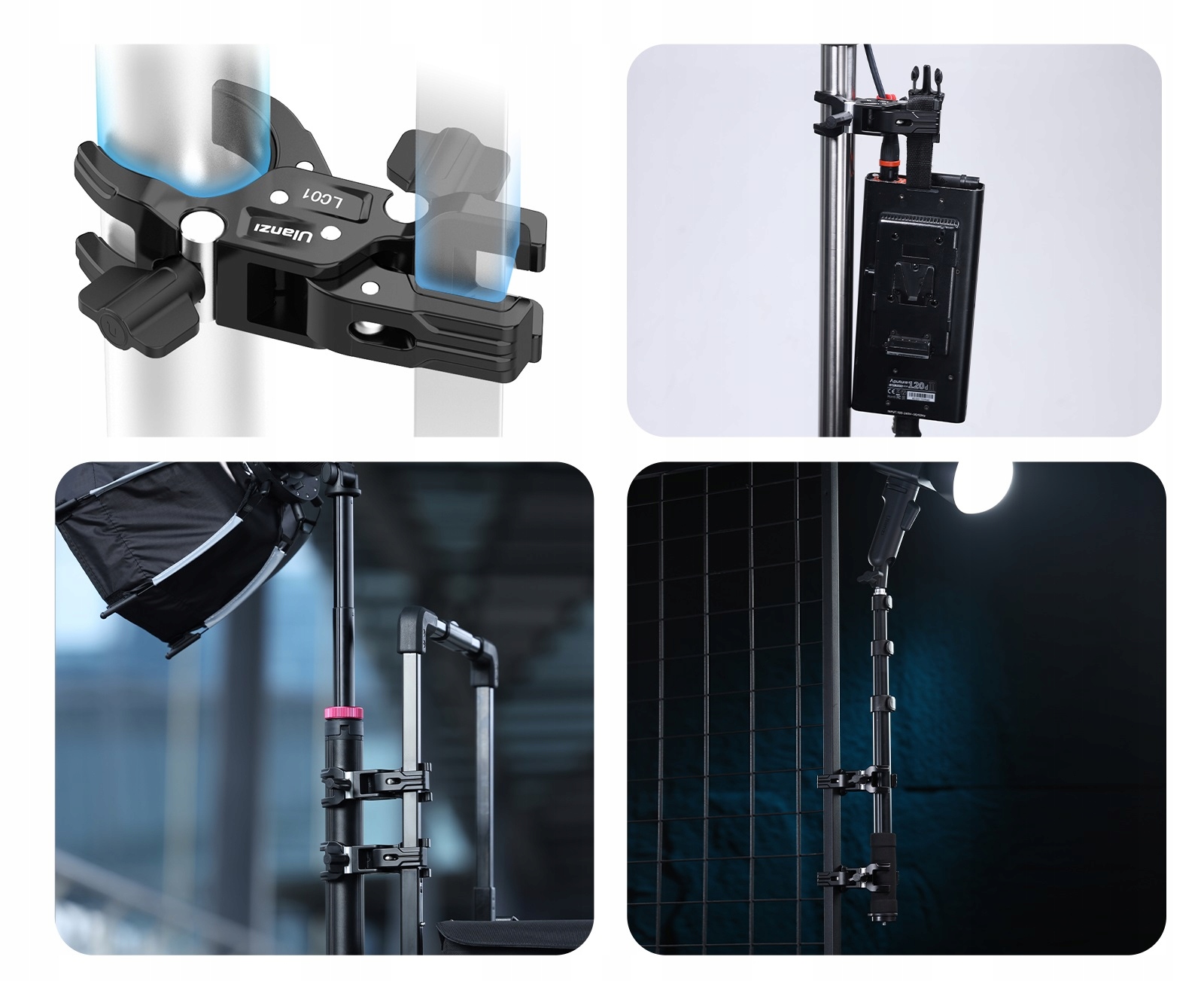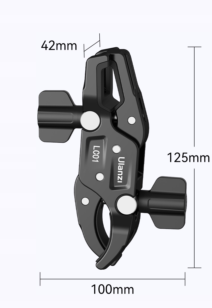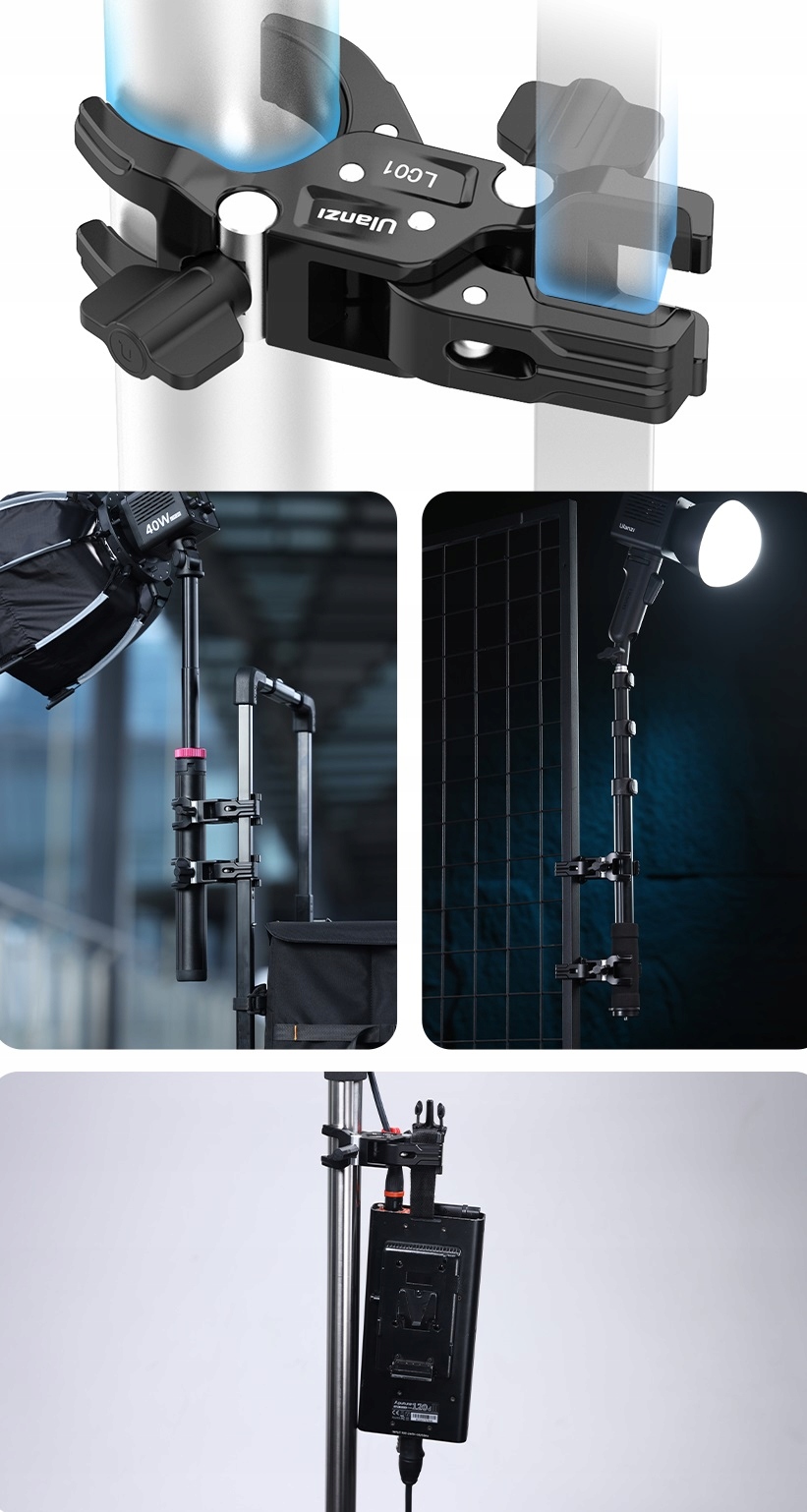 Подвійний VICE дозволяє встановити фотографічні аксесуари, такі як парасольки, статичні, селфі, софтики, софтики, світлодіодні світильники для всіх видів профілів, променів, трубок з діаметром від 12 до 58 мм.