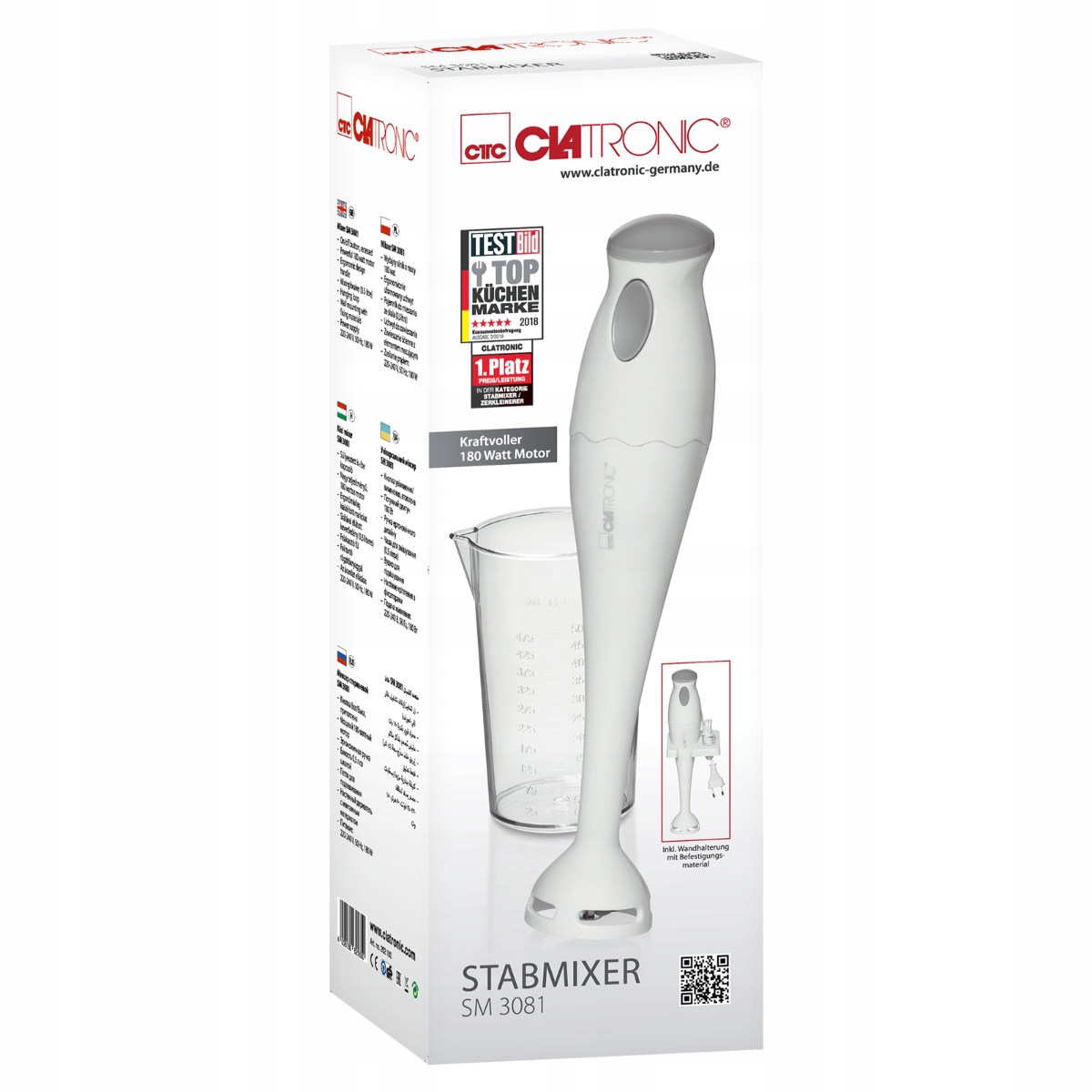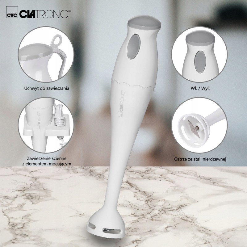 Clatronic SM 3081 - це блендер з ємністю, яку ви завжди можете мати зверху - він додасть шарму та стилю вашій кухні. Ви також можете підвісити його за допомогою петлі на ручці - він буде під рукою, коли вам це знадобиться.