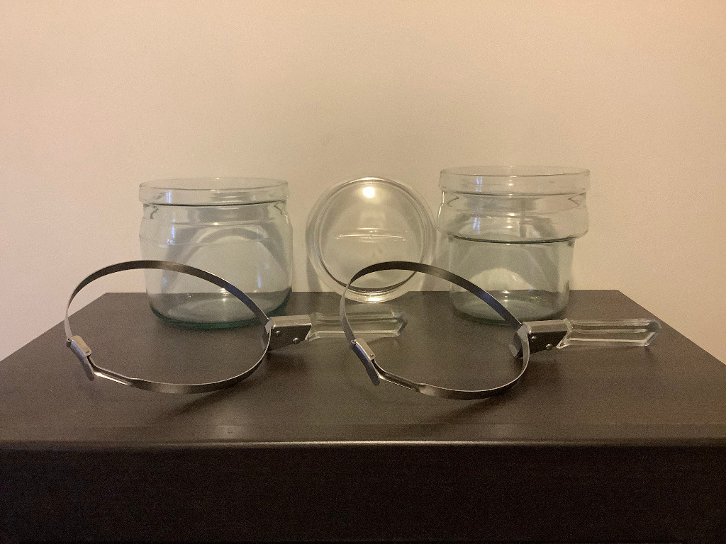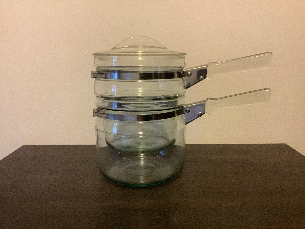 Подвійний котел Pyrex Flameware Double Boiler (bain-marie, bain-marie), виготовлений компанією Corning Glass Works у Корнінгу, штат Нью-Йорк, США у 1938-1951 роках.