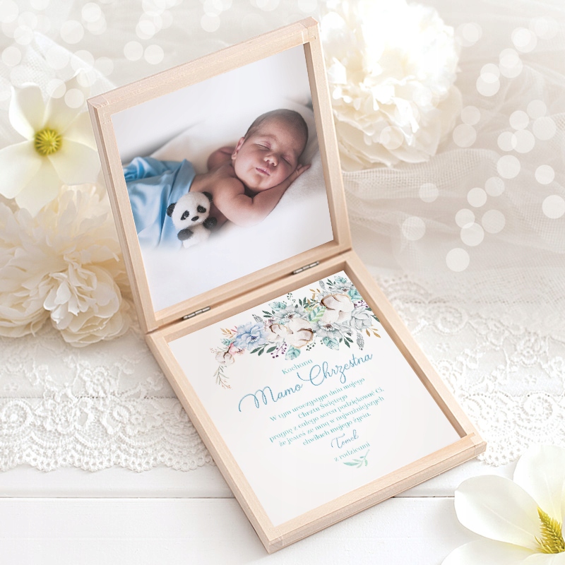 • Плоска дерев'яна скринька кольору натурального дерева. Внутрішня сторона кришки прикрашена фотографією вашого сина, яку ми надрукуємо для вас. Дно коробки прикрашає персональна листівка з ім’ям дитини, красивою графікою з синіми квітами та зворушливим текстом подяки: