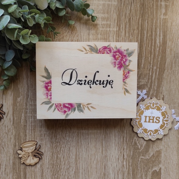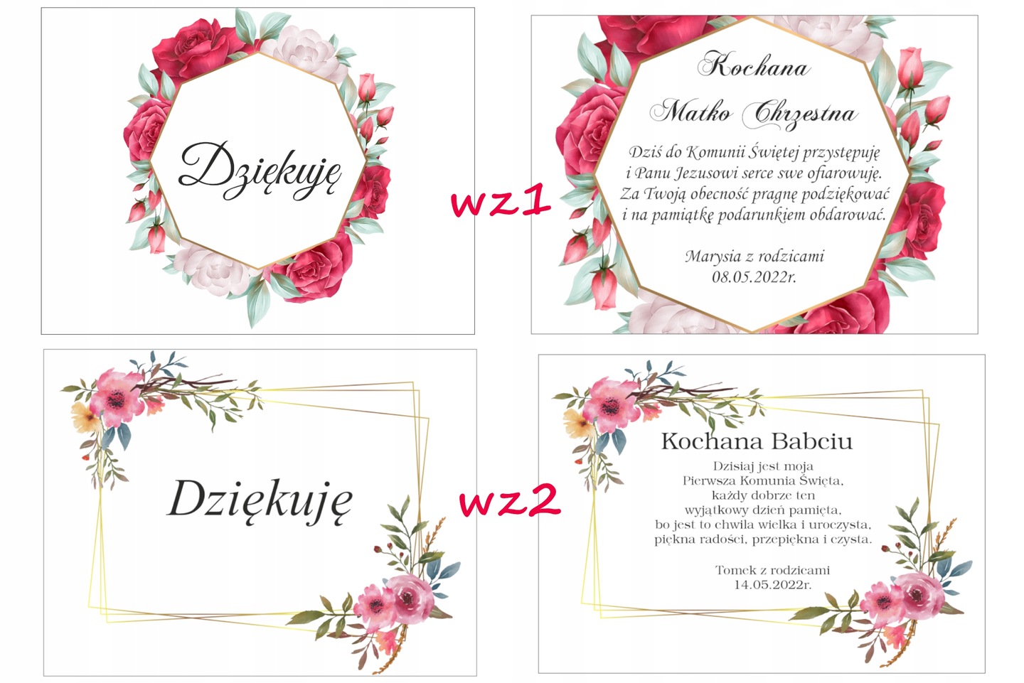 - Унікальна форма подяки за Вашу присутність на Першому Святому Причасті для особливих гостей, наприклад, дідуся чи бабусі або хресних батьків (текст подяки буде адаптований до вибраної особи : хрещена мати, хрещений тато, хрещені батьки, бабуся, дідусь, бабуся, дідусь, прадідусь)