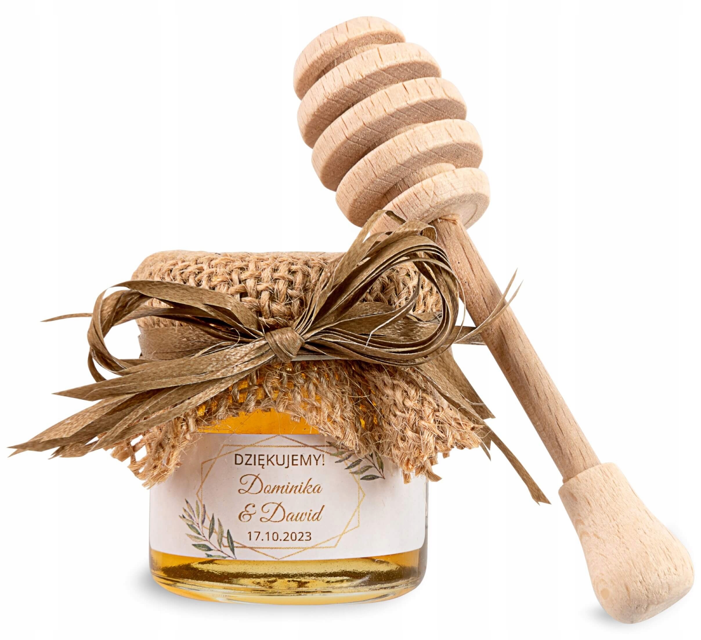 Баночки 40 мл, наповнені справжнім медом, як подарунок подяки з дерев’яною ложкою та готовою прикрасою
