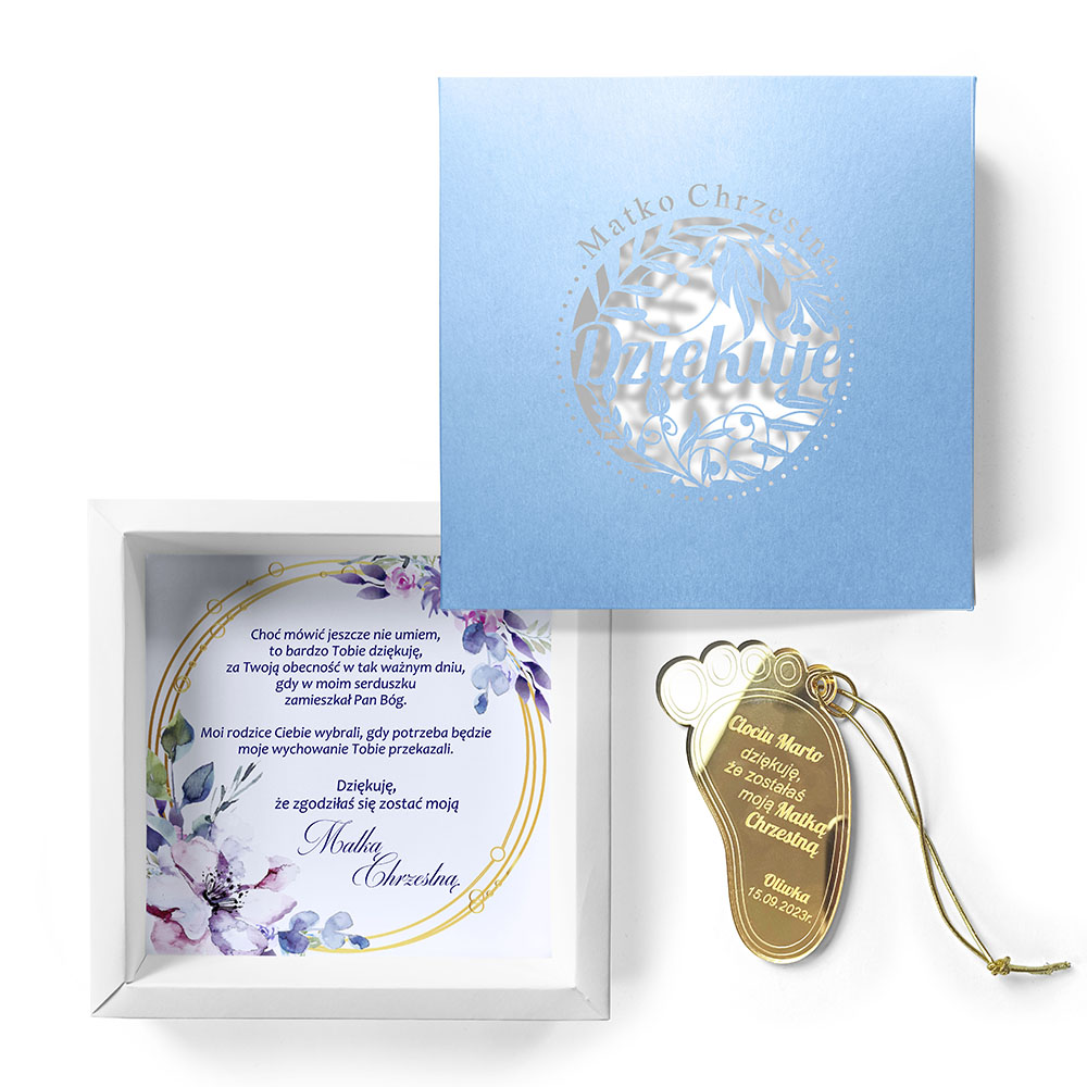 Золоті ніжки з вигравірованим іменем хрещеної матері/хрещеного батька, ім’ям дитини, яку хрестять, і дата хрещення, b>стане незабутнім і довгим сувеніром про цей чудовий день. Ніжки з дзеркального матеріалу упаковані в красиві декоративні коробки з високоякісного металізованого паперу, пофарбованого в масі в синій колір. Кришка декорована точною лазерною порізкою. Всередині є надрукована подяка для хрещеної матері/хрещеного батька, прикрашена квітковим мотивом.