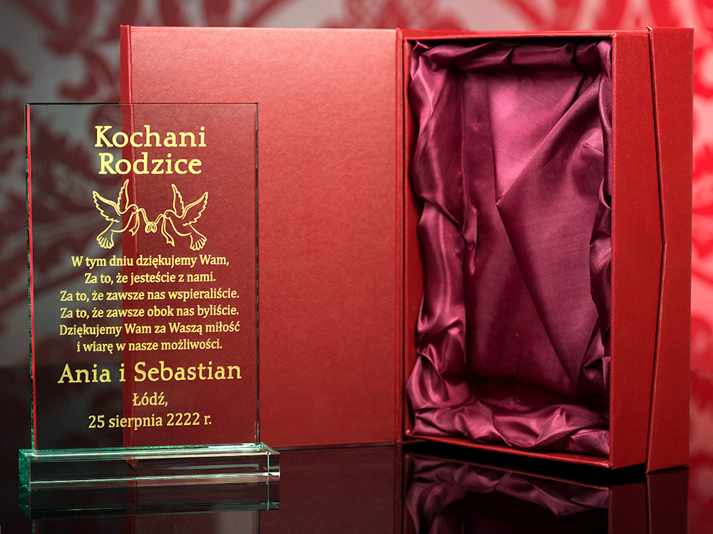 Красива подяка виготовлена за допомогою технології лазерного гравіювання безпосередньо на предметі. Скляна статуетка виглядає чудово завдяки інноваційній формі, а завдяки вирізам створює незабутнє естетичне враження. Встановлений на міцну основу з такого ж матеріалу, які міцно з'єднані між собою, він неодмінно запам'ятається одержувачу. Ви більше ніде не знайдете такої високої якості. Крім того, гравіювання наноситься майстром вручну і дуже акуратно спеціальною фарбою. Позолота/срібло переливається на світлі та дає дивовижний ефект. До всього доповнює красивий бордовий чохол з бордовим атласом, в якому статуетка виглядає ще красивіше, а позолота виділяється на тлі чохла. Можу зробити для вас - ПОДАРУНОК НА БУДЬ-ЯКИЙ НАВОД (весілля, гостини, хрещення, причастя, день народження, вісімнадцяти іменини, ювілей, річниця весілля, день матері та батька, день дідуся та бабусі, день Святого Валентина, день вчителя, тощо). b>