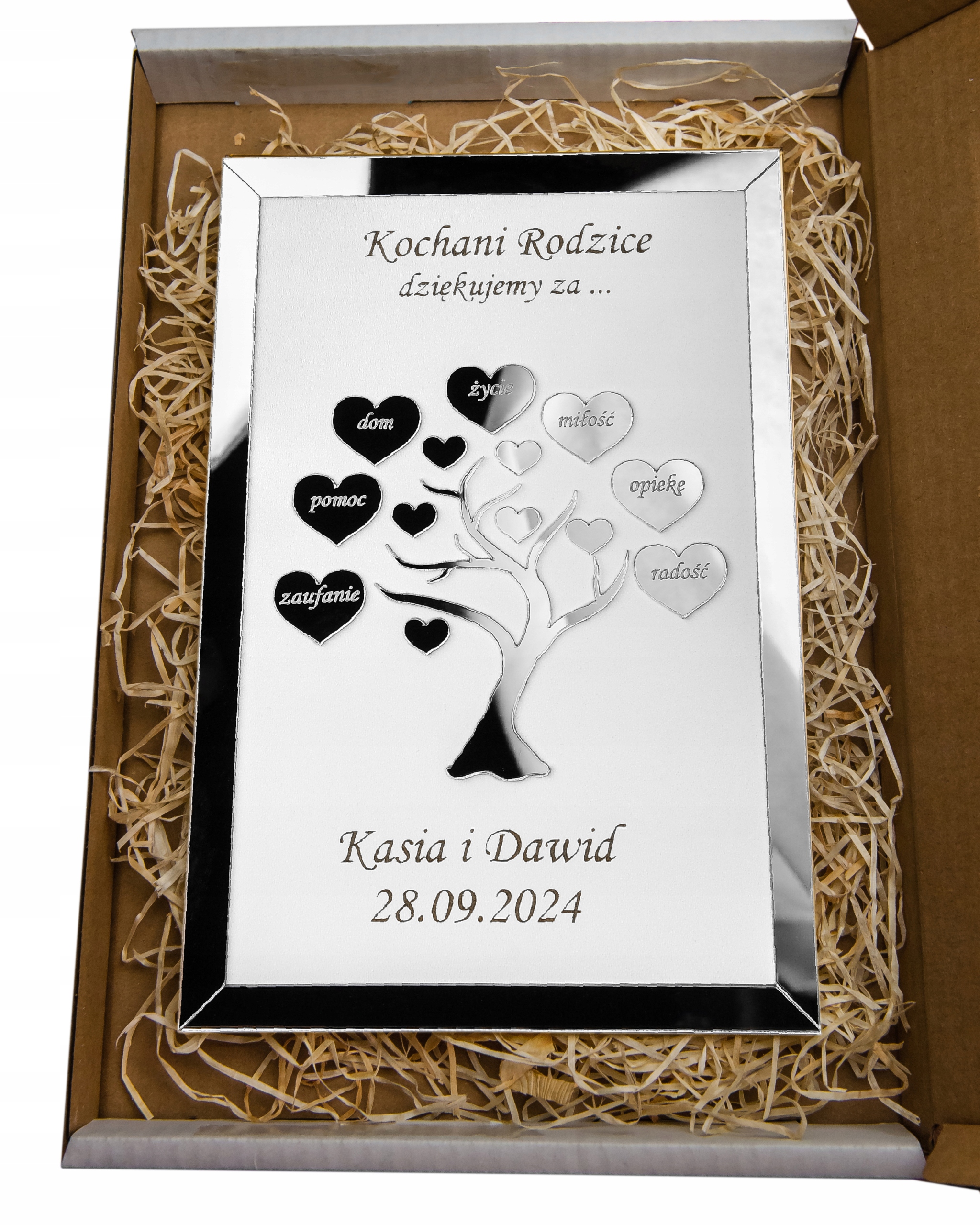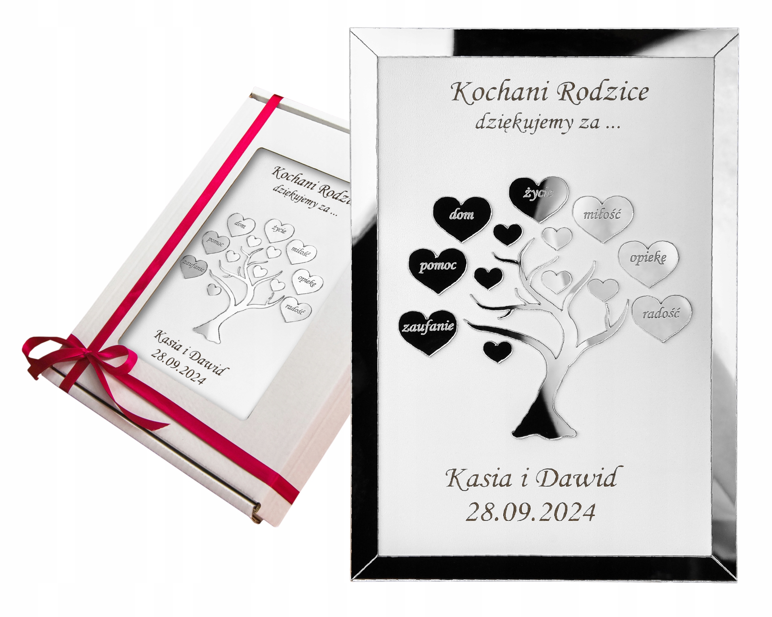 Записка подяки упакована в стильну білу коробку з прикріпленою декоративною червоною стрічкою, щоб зав’язати її самостійно. Це робить подарунок елегантним і готовим до дарування без додаткового пакування. У білу коробку ми додаємо деревну вовну, яка є прикрасою та додатковим захистом подяк. БЕЗКОШТОВНО ми додаємо безбарвну підставку.