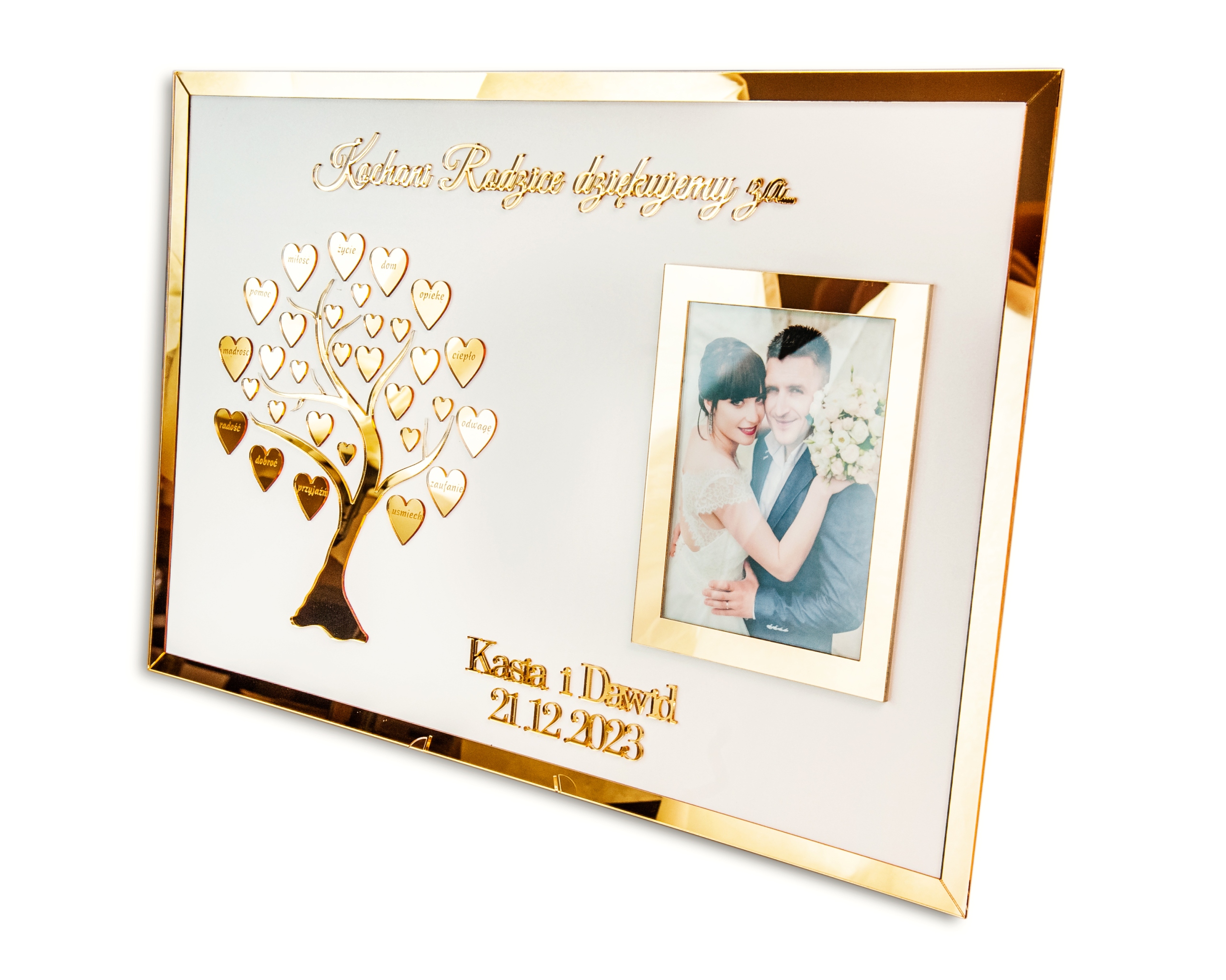 Гарний весільний сувенір, який також може бути прикрасою. Написи виготовлені методом лазерної вирізки із золотого дзеркала та наклеєні нами на білу МДФ плиту. На сердечках викарбувано слова подяки.