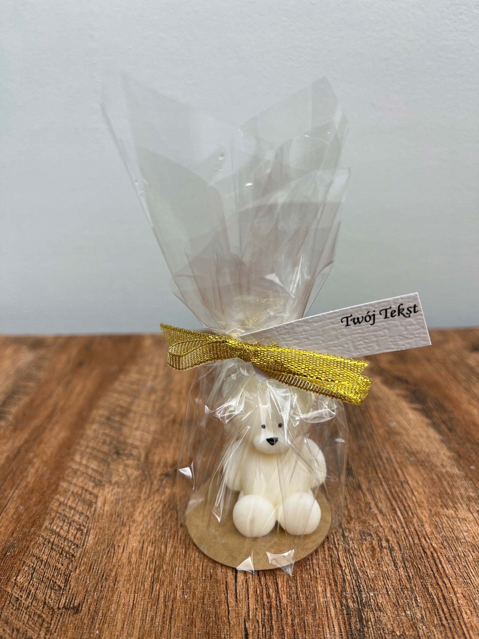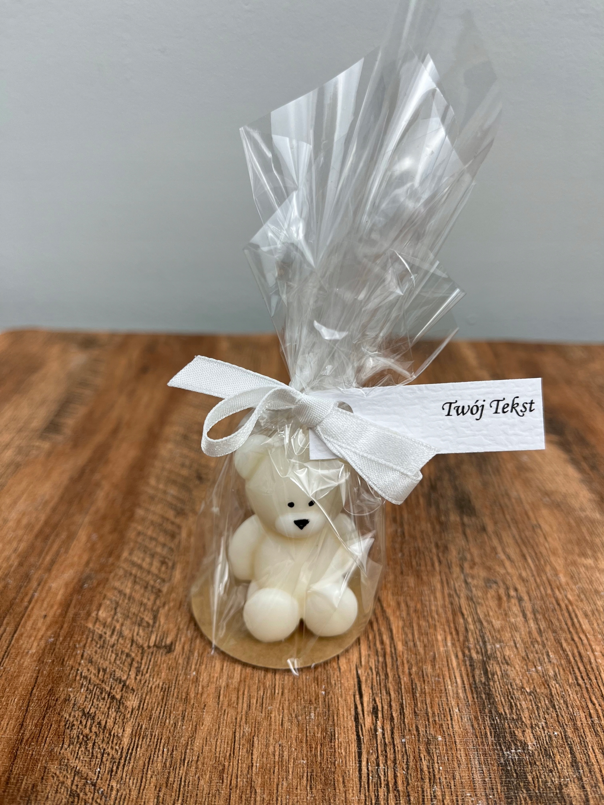 Свічка соєва декоративна "Ведмедик Тедді", біла, упакована в целофан з білою етикеткою