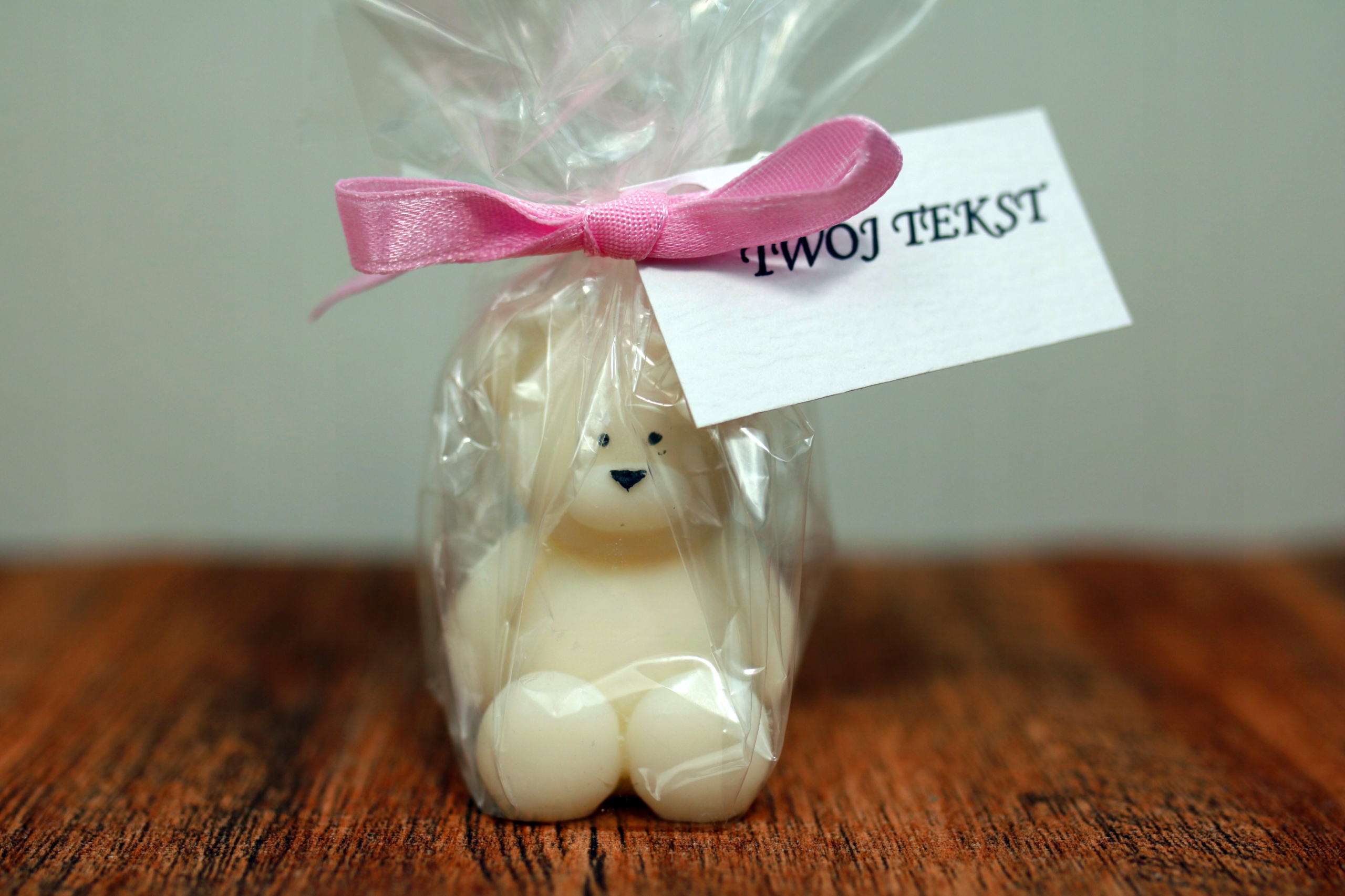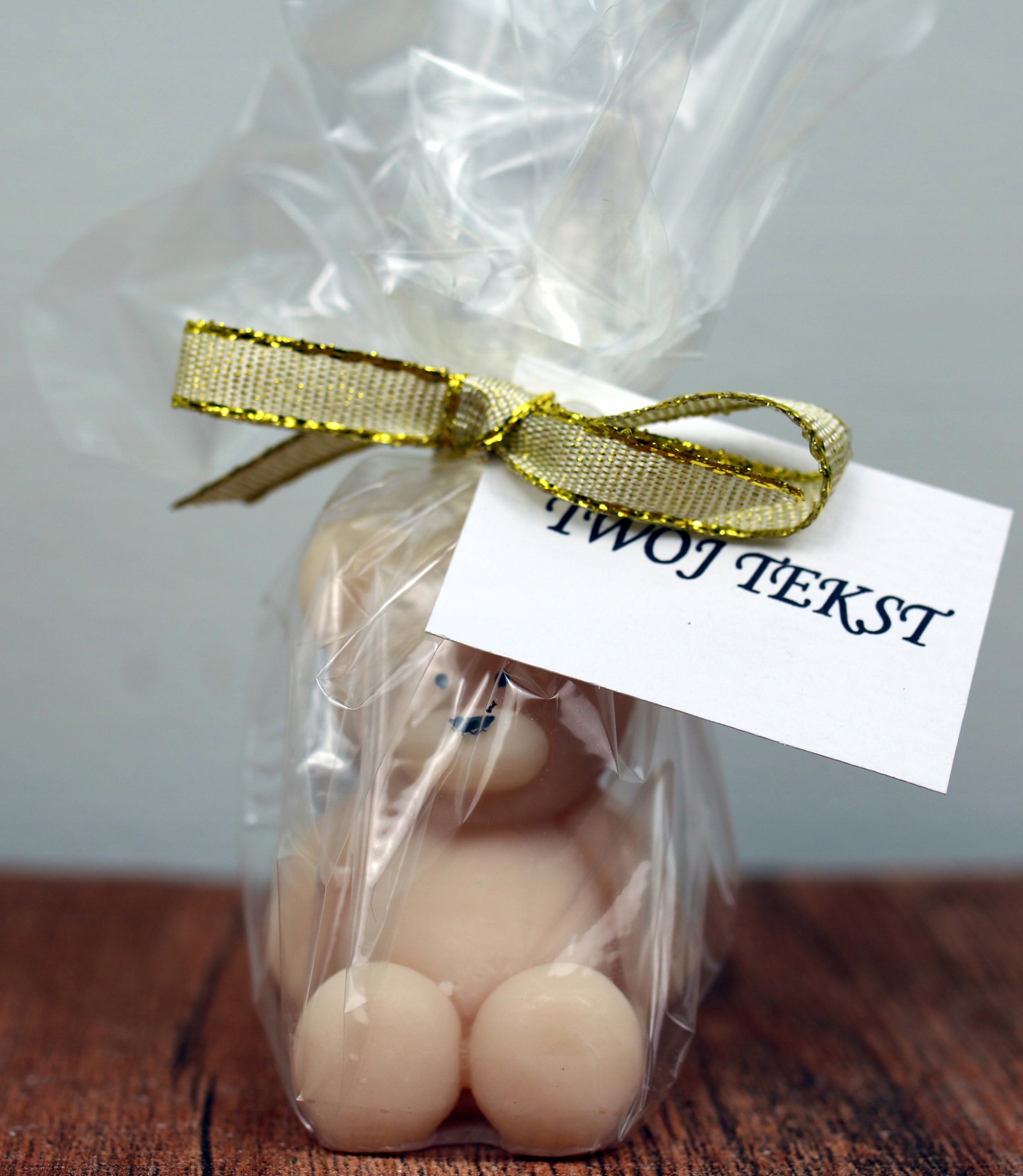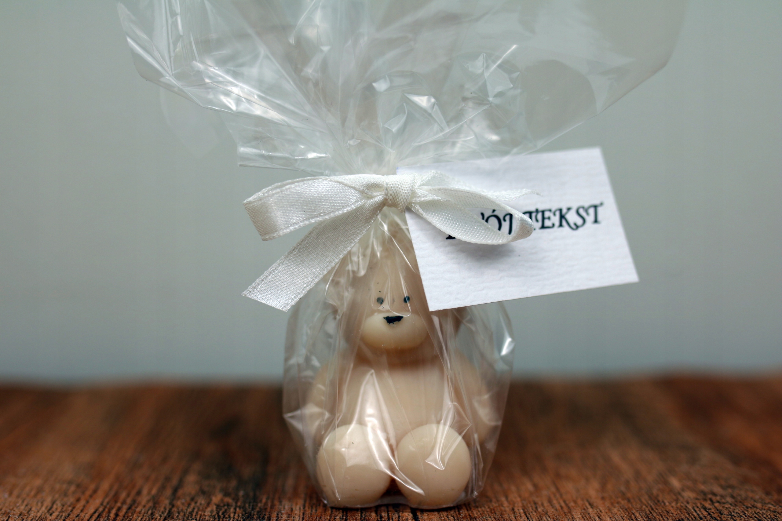 Свічка соєва декоративна «Ведмедик Тедді», бежева, упакована в целофан з білою етикеткою