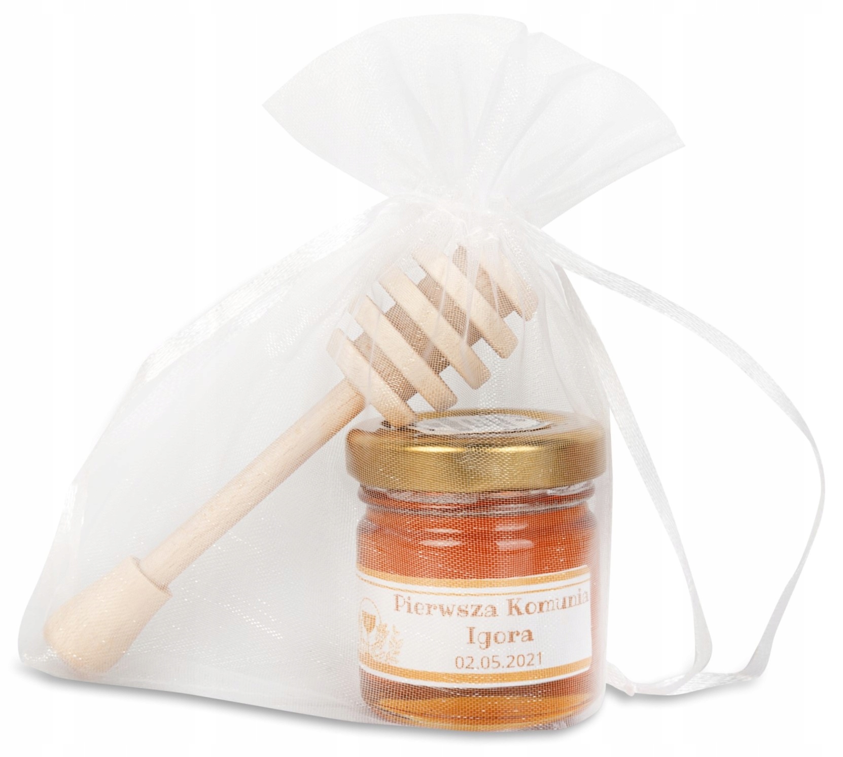 Баночки 40 мл, наповнені справжнім медом, як подарунок подяки з дерев’яною ложкою, все в пакеті з органзи