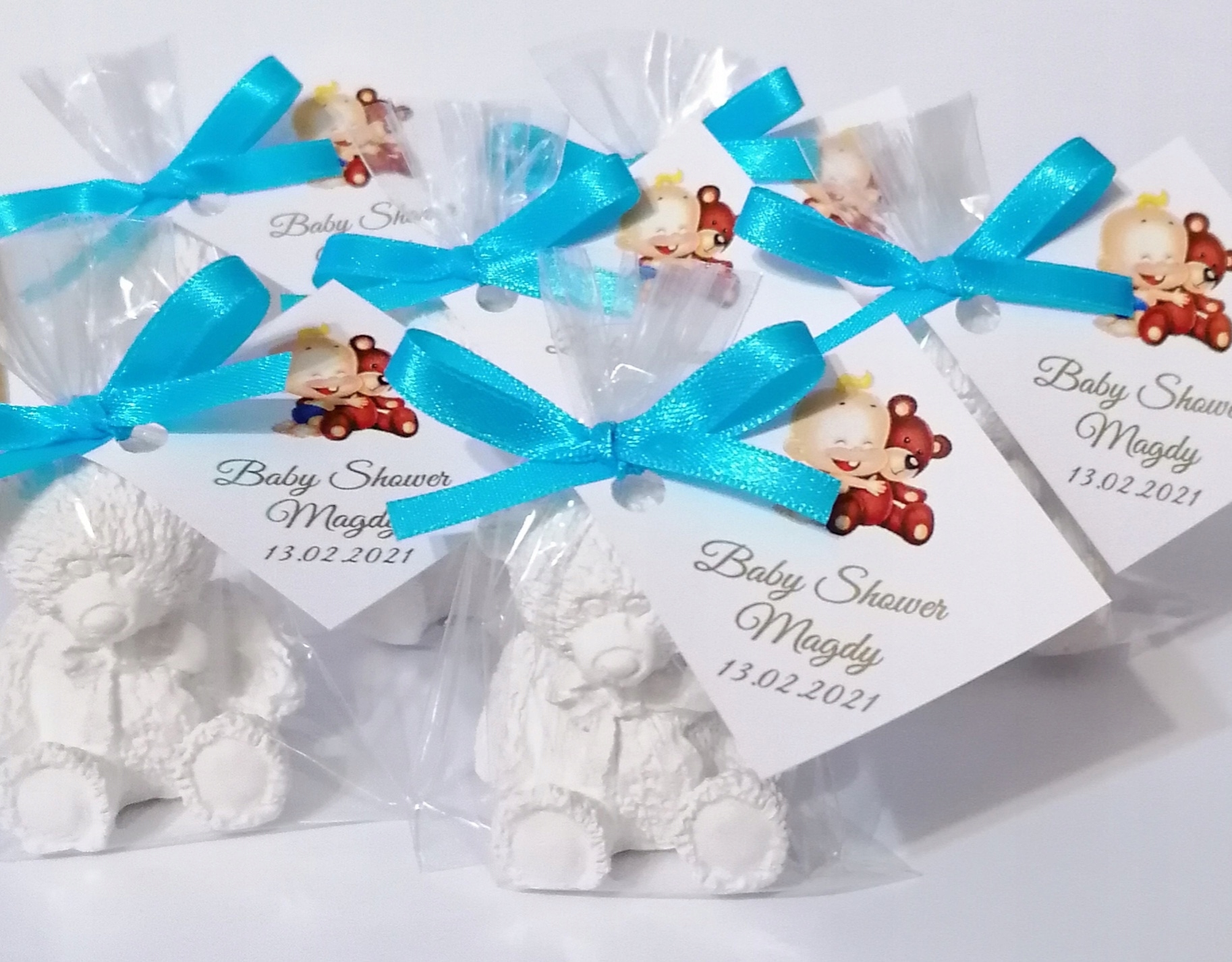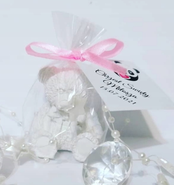 Гарний подарунок для наших гостей, які прийшли на свято нашого малюка - це гіпсовий зліпок ведмедика, перев'язаний атласною стрічкою та листівка з ім'ям дитини.