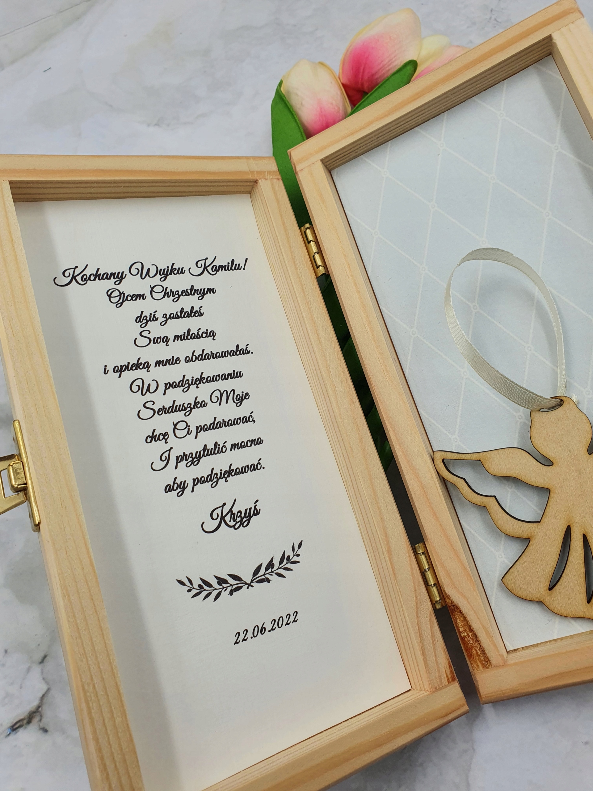 Ми представляємо дерев'яну скриньку як спосіб подяка хрещеній мамі, куму, бабі та дідусеві, гостям.
