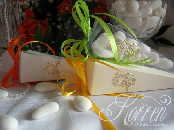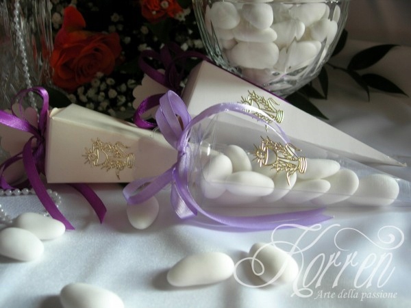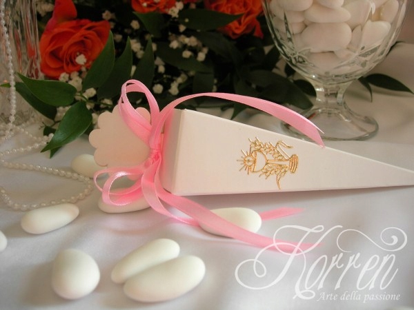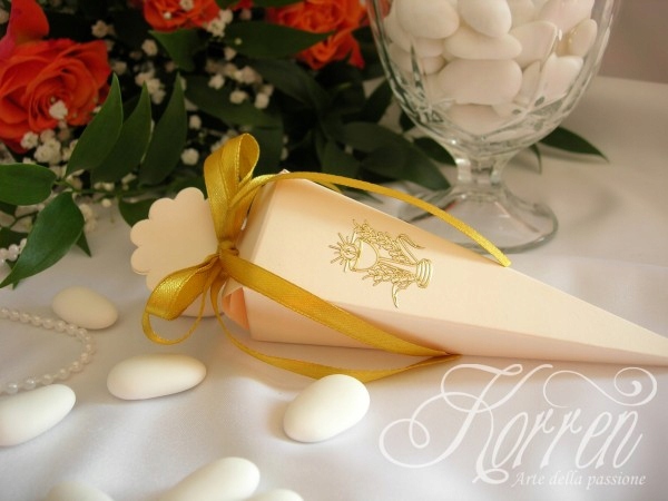 Елегантна конусна коробка з хостом із високоякісного паперу , з 5 льодяними цукерками всередині. в тюлевому мішечку, все прикрашено ідеально зав’язаними бантами та прикріпленою листівкою з принтом, віршем, іменами та датою.