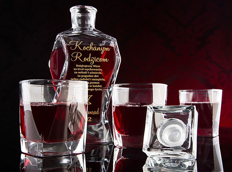 Чудовий скляний графин ручної форми, який робить кожен унікальним та унікальним. Збоку має спеціальний ламаний малюнок, який підкреслює, що графин виглядає дуже дорого. Він чудово виглядає завдяки своїй інноваційній формі, що забезпечує незабутнє естетичне та візуальне враження. Продавець повідомляє, що графини виготовляються вручну на склозаводі та іноді можуть містити бульбашки повітря всередині скла та дрібні подряпини на поверхні, що є результатом виробничого процесу. Можу зробити для вас - ПОДАРУНОК НА БУДЬ-ЯКУ НАХОДУ (весілля, прийом, день народження, вісімнадцятиріччя, іменини, ювілей, річниця весілля, день батька, день дідуся тощо).