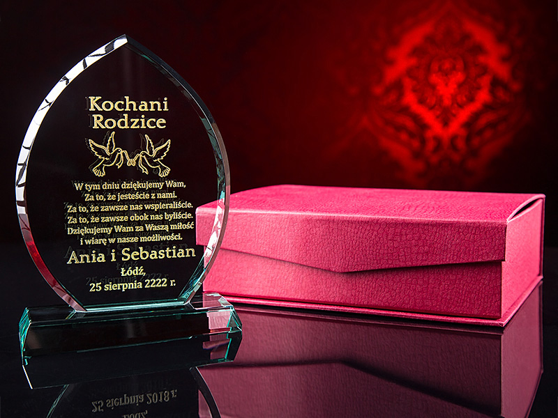 Красива подяка виготовлена за допомогою технології лазерного гравіювання безпосередньо на предметі. Скляна статуетка виглядає чудово завдяки інноваційній формі, а завдяки вирізам створює незабутнє естетичне враження. Встановлений на міцну основу з такого ж матеріалу, які міцно з'єднані між собою, він неодмінно запам'ятається одержувачу. Ви більше ніде не знайдете такої високої якості. Крім того, гравіювання наноситься майстром вручну і дуже акуратно спеціальною фарбою. Позолота/срібло переливається на світлі та дає дивовижний ефект. До всього доповнює красивий бордовий чохол з бордовим атласом, в якому статуетка виглядає ще красивіше, а позолота виділяється на тлі чохла. Можу зробити для вас - ПОДАРУНОК НА БУДЬ-ЯКИЙ НАВОД (весілля, гостини, хрещення, причастя, день народження, вісімнадцяти іменини, ювілей, річниця весілля, день матері та батька, день дідуся та бабусі, день Святого Валентина, день вчителя, тощо). b>