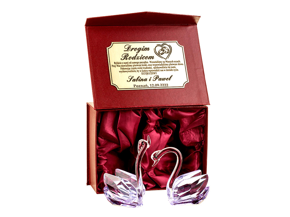 Красиві два різні кришталеві лебеді, упаковані в чудовий бордовий корпус із посвятою, яка виготовлена в технології лазерного гравіювання на золоті або сріблястому ламінаті. Лебеді чудово виглядають завдяки інноваційній ручній формі та шліфуванню. Естетичне виконання, безумовно, запам’ятається одержувачем і буде виглядати красиво в почесному місці у кожному будинку. Ви не знайдете такої високої якості ніде більше. Я можу зробити для вас - подарунок на будь -який випадок (весілля, весілля, хрещення, причастя, день народження, вісімнадцять імен імен, ювілей, річницю весілля, день матері та батька, дідусь та день бабусі, День Святого Валентина, День вчителя тощо). 4,5 см - вища лебедя