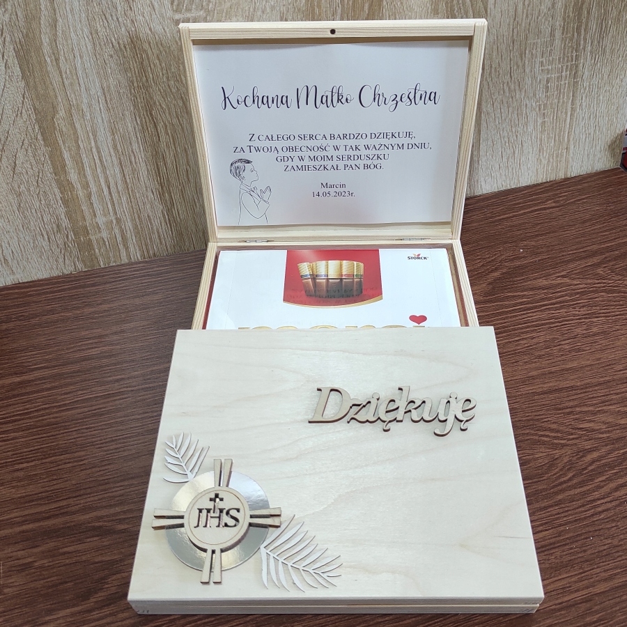 - На коробці зверху вирізаний з фанери напис: Дякую, знак IHSз декоративними листочками