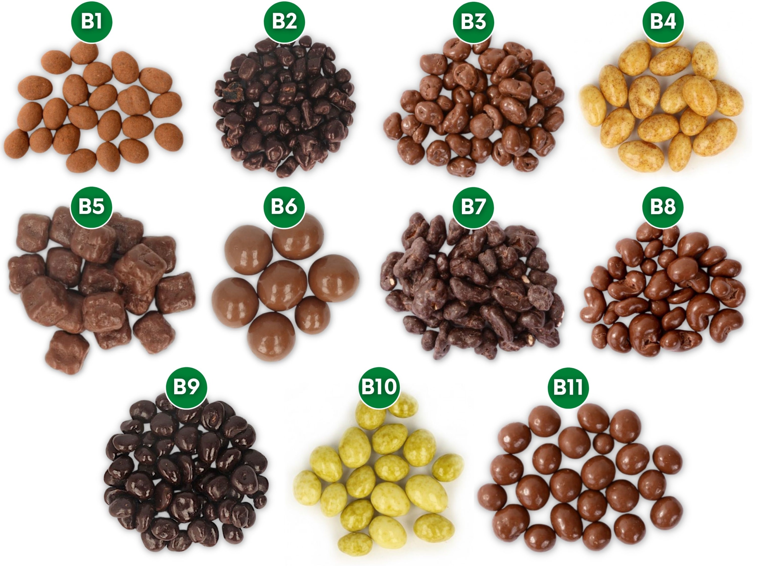 - B8 - Кеш'ю в молочному шоколаді. Склад: шоколад молочний 74% (цукор, какао-масло, сухе молоко, суха сироватка, какао терте, емульгатор: соєвий лецитин, екстракт ванілі), смажені горіхи кешью 25%, суміш для глазурування 1% (сироп глюкози, глазурувальник (гуміарабік, шелак), рослинна олія (кокосова, рапсова), модифікований крохмаль тапіоки). Вміст сухого какао не менше 31%.