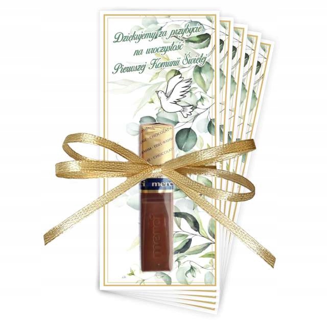 Невеличка подяка гостям на церемонії Першого Святого Причастя є дуже відомою та популярною традицією. У набір входить 5 двосторонніх щільних картонів з місцем для склеювання, наприклад, шоколадних цукерок Merci, і 5 золотих атласних стрічок, якими ви можете самостійно зав'язати бантики після приклеювання шоколаду. На картоні поруч із мотивом листя евкаліпта та маленького голуба надруковано текст «Дякуємо, що прийшли на Перше Святе Причастя». Таку подяку зазвичай дарують кожному, хто бажає і дарує, наприклад, телеграму або квіти. Ще одна дуже популярна форма — розкласти подяки на парадному столі біля сервіровки кожного гостя. Це дозволяє гостям зайняти своїх гостей протягом перших кількох хвилин, які іноді оповиті незручною тишею. Крім того, таке рішення означає, що ніхто з гостей не залишиться без уваги :)