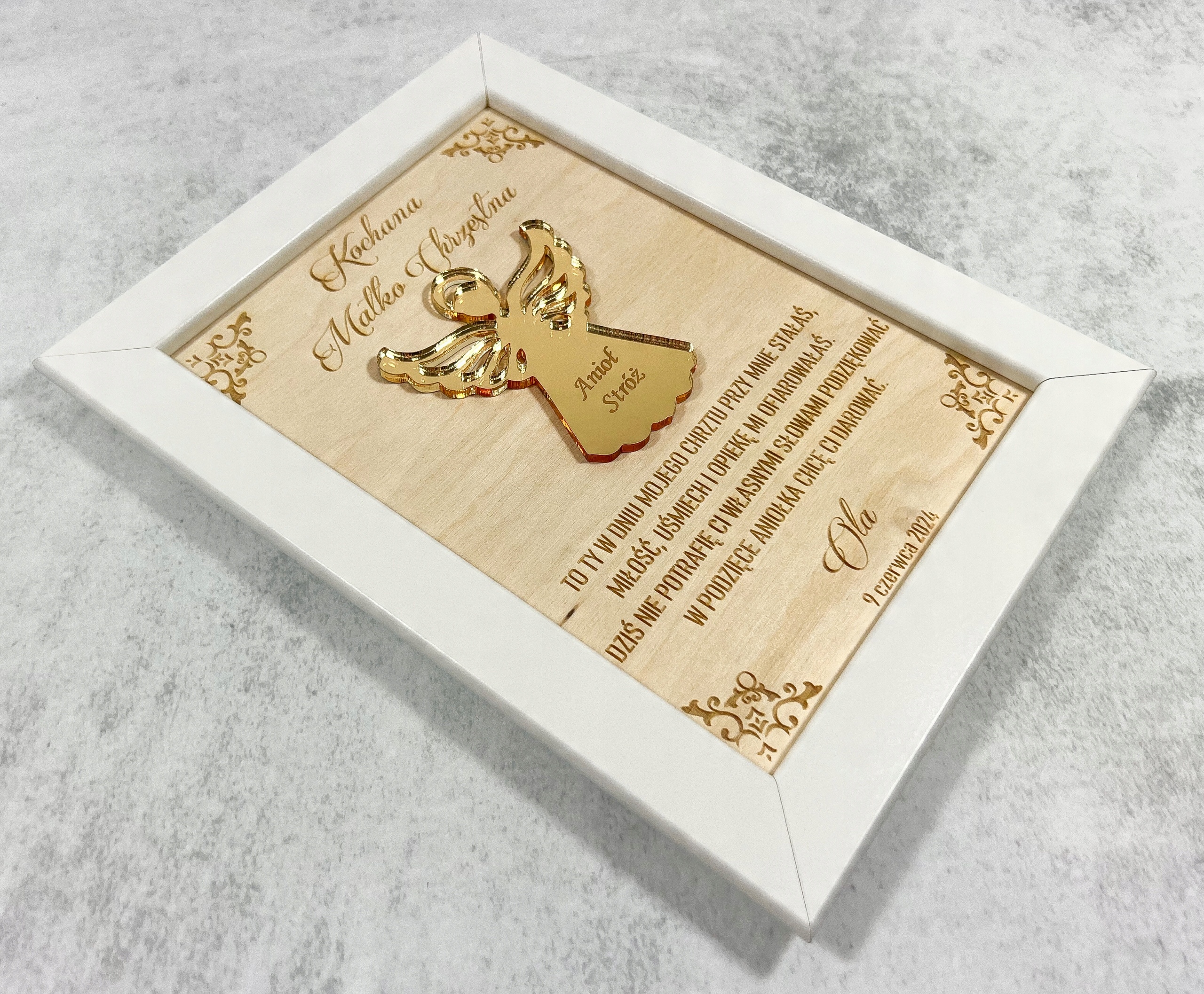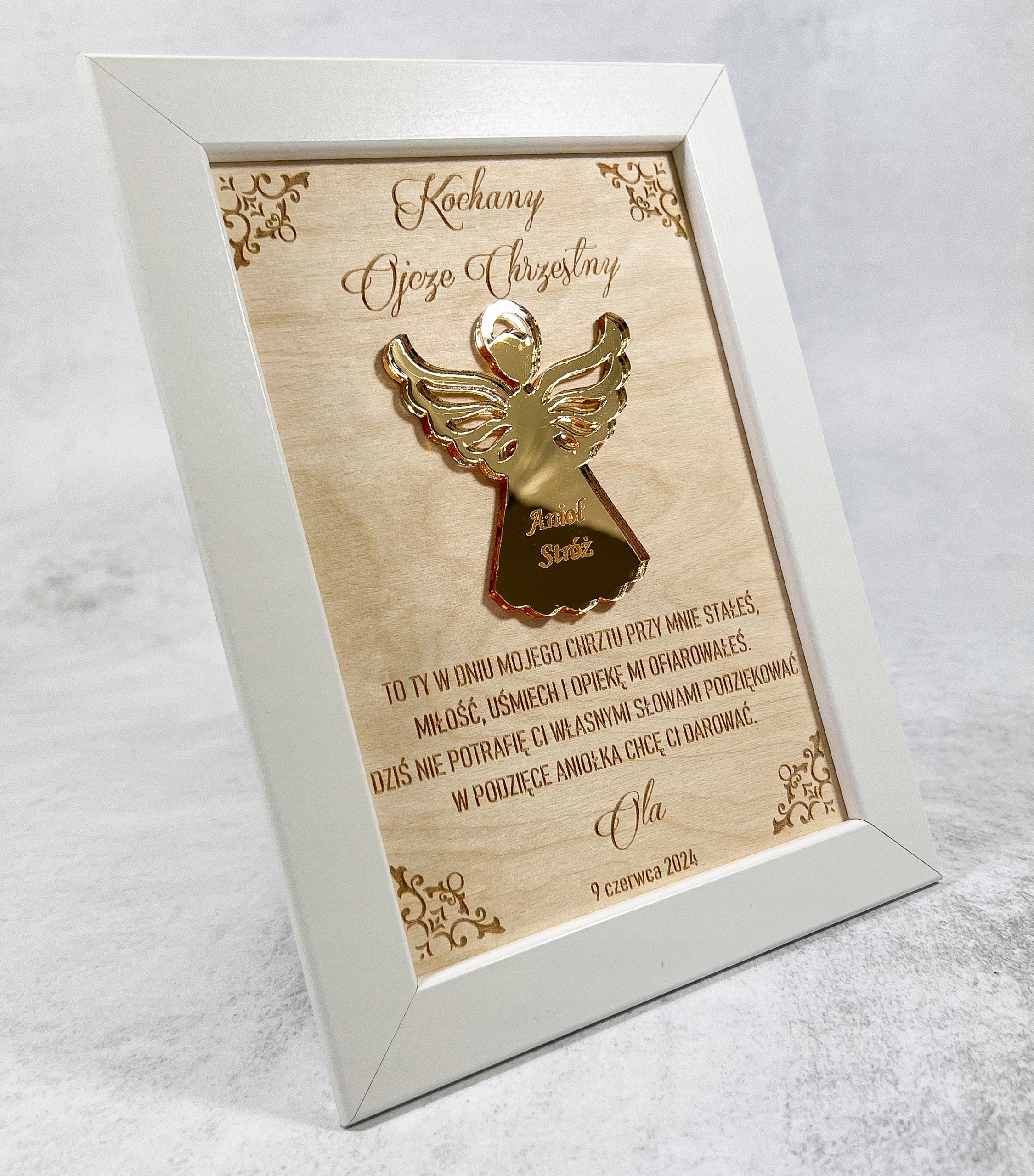 Біла рамка із золотим ангелом-охоронцем. Гарний сувенір на Святе Хрещення.