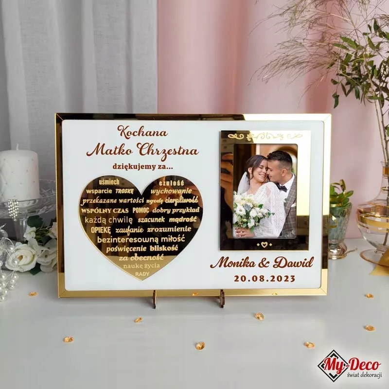 Пропонована подяка для хрещених та бабусь і дідусів Весілля виготовлено з високоякісного золотого оргскла, що надає йому елегантності та довговічності. Їх унікальний дизайн і вишукані деталі роблять їх ідеальним подарунком для цієї особливої події. Подяка батькам має форму вишуканої рамки розміром 40×27 см, на якій розміщено золоте серце з подяками. На плиті HDF, на якій базується весільна подяка, ми можемо вигравірувати імена нареченого та нареченої, дату весілля та присвяту – все вигравірувано за допомогою новітньої лазерної технології. Розмір фотографії для рамки 10х15 см.
