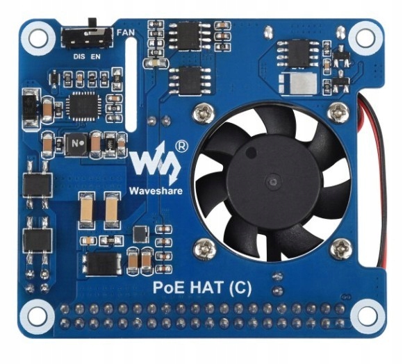 Модуль розширення (HAT) для джерела живлення PoE для Raspberry Pi 3B+ і Raspberry Pi 4B. Це дозволяє використовувати інтерфейс Power over Ethernet для живлення Raspberry Pi через кабель Ethernet, усуваючи потребу в окремому джерелі живлення. Модуль відповідає стандарту IEEE 802.3af На платі є конвертер, який забезпечує живлення Raspberry Pi і зовнішніх пристроїв, підключених до USB A (до 4 А). Модуль також оснащений вентилятором для забезпечення належного охолодження. Ці функції дозволяють використовувати модуль у проектуванні та розробці вбудованих систем, комунікацій і мереж, а також IoT (Інтернет речей). Повна документація з прикладами використання доступна на Wiki продукту.