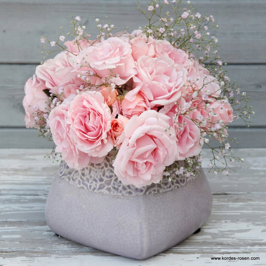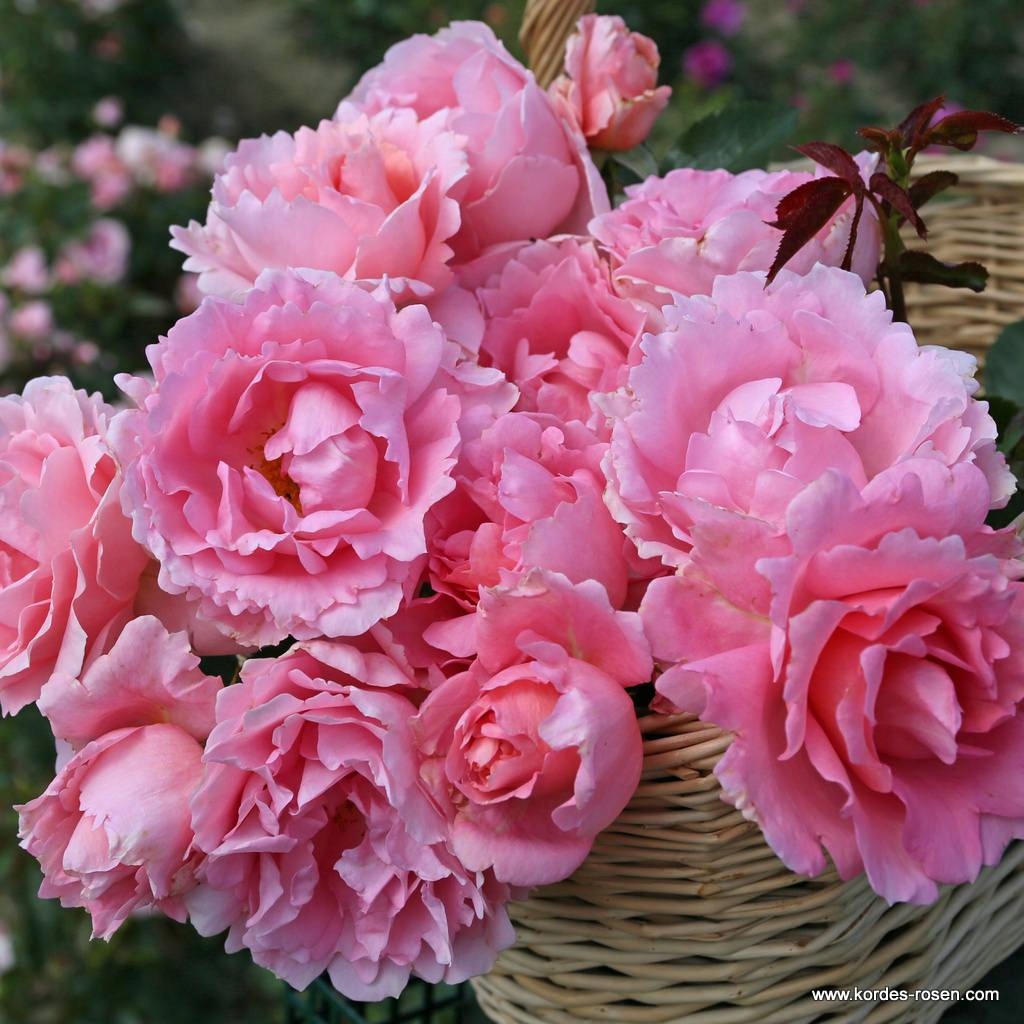 Квітки середнього розміру чарівно зазубрені, напівмахрові та нещільно заповнені пелюстками, які надають квітам легкості. Форма квітки скомпонована в чашки з ніжним ароматом. Дуже рясно цвіте численними букетами, що складаються з кількох квіток, зібраних на кінцях пагонів, і дуже добре їх повторює протягом усього сезону. Красивий пастельно-рожевий відтінок часто переходить у блідий, ніжний рожевий, який гарно виділяється на тлі темно-зеленого блискучого листя.