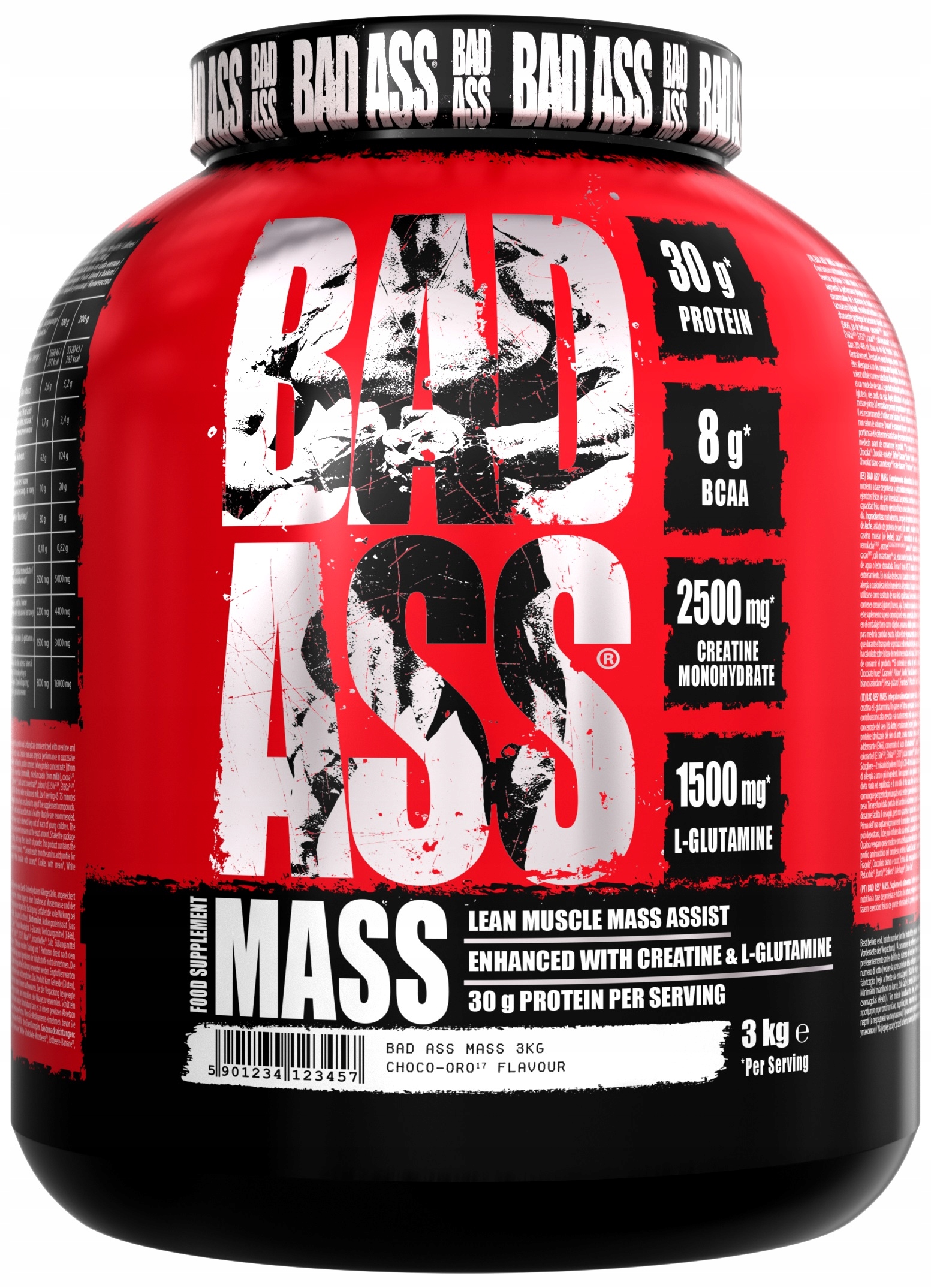 Bad Ass® Mass. Дієтична добавка. містить підсолоджувач. Останнє покоління Gainer. Порошок для приготування живильного білка-карбогідратного напою, збагаченого креатином та L-глутаміном. Розроблений для дорослих, які виконують фізичні вправи високої інтенсивності. Білок сприяє зростанню м’язової маси та допомагає його підтримувати. Креатин збільшує фізичні показники у випадку послідовних коротких, дуже інтенсивних фізичних вправ, а сприятливий ефект спостерігається після споживання 3 г креатину на день.