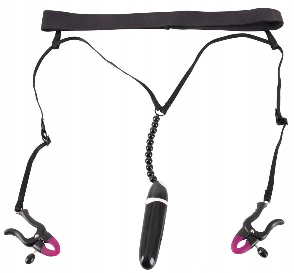 Окрім затискачів, на рядку є невеликий вібратор, прикріплений до струни з намистинами для стимуляції клітора. Акумулятор знаходиться в наборі.
