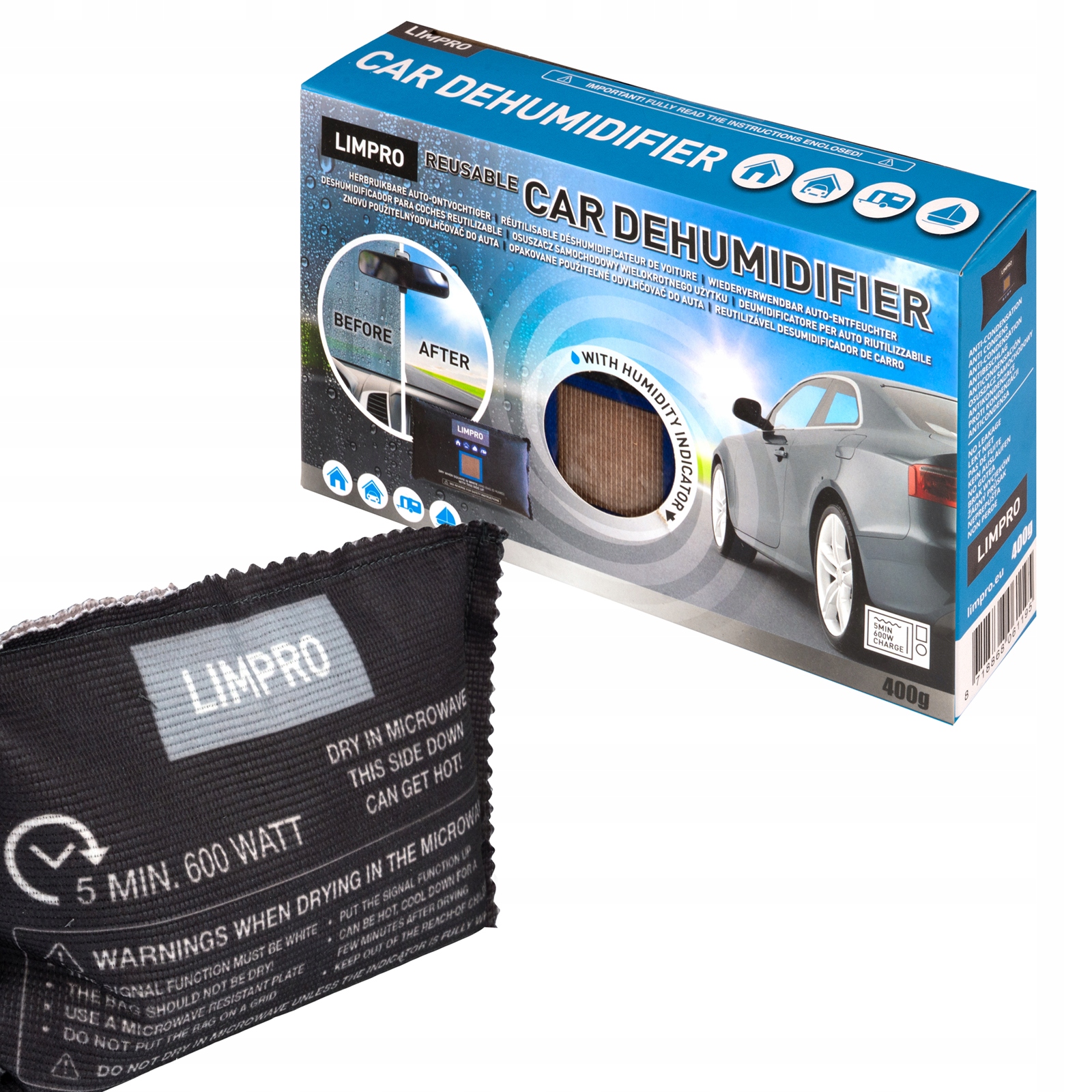 Є індикатор вологості; коли він змінює колір (наприклад, з коричневого на білий), це означає, що абсорбер досяг максимальної поглинаючої здатності і його слід висушити або регенерувати. Корпус компактний і його можна розмістити всередині автомобіля в різних місцях.