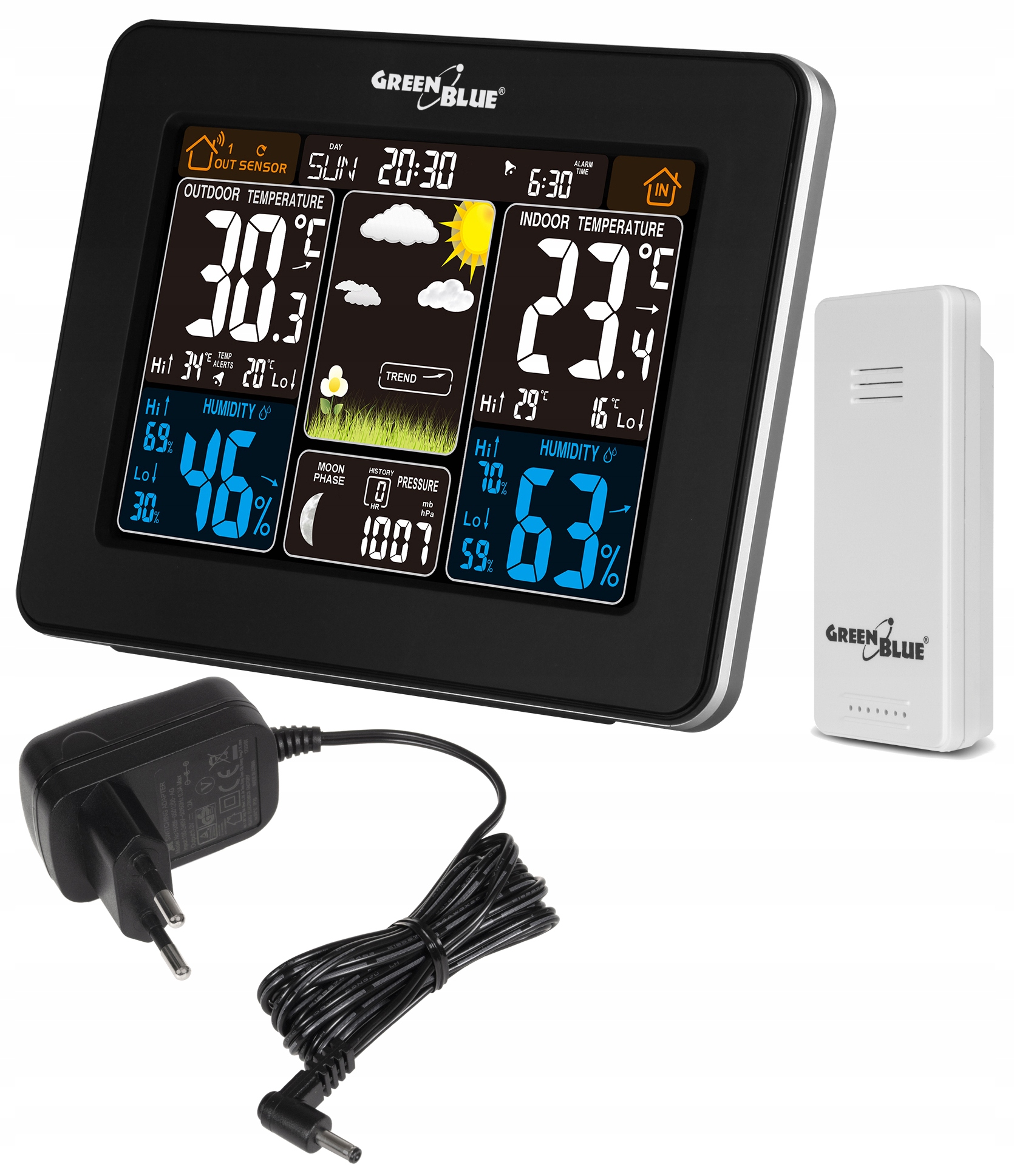 Сучасна метеостанція GreenBlue GB523 з великим розбірливим дисплеєм.