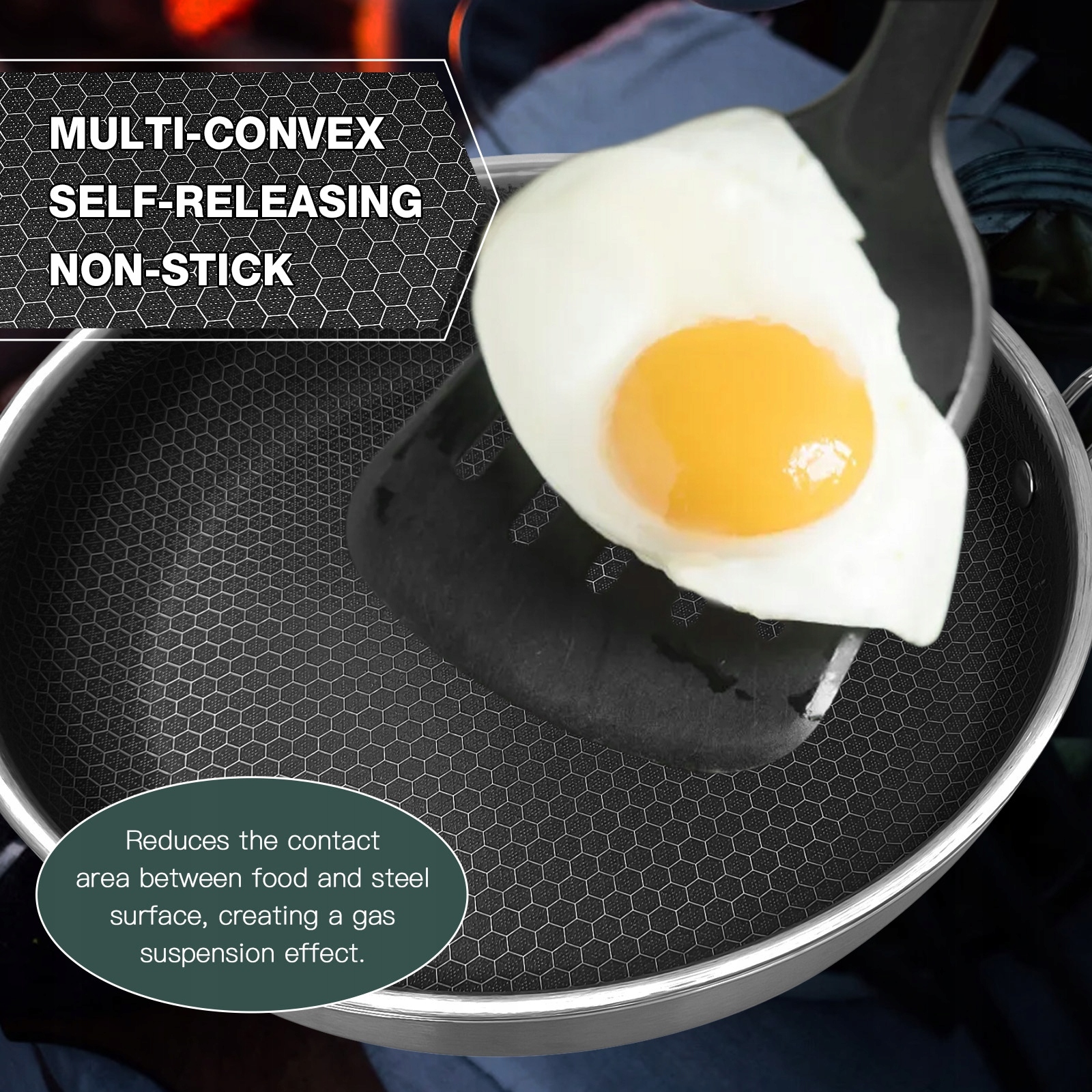Функція:1. Антипригарна поверхня: передова багатоопукла технологія самовивільнення мінімізує контакт з їжею для легкого очищення та ідеального підрум’янювання.