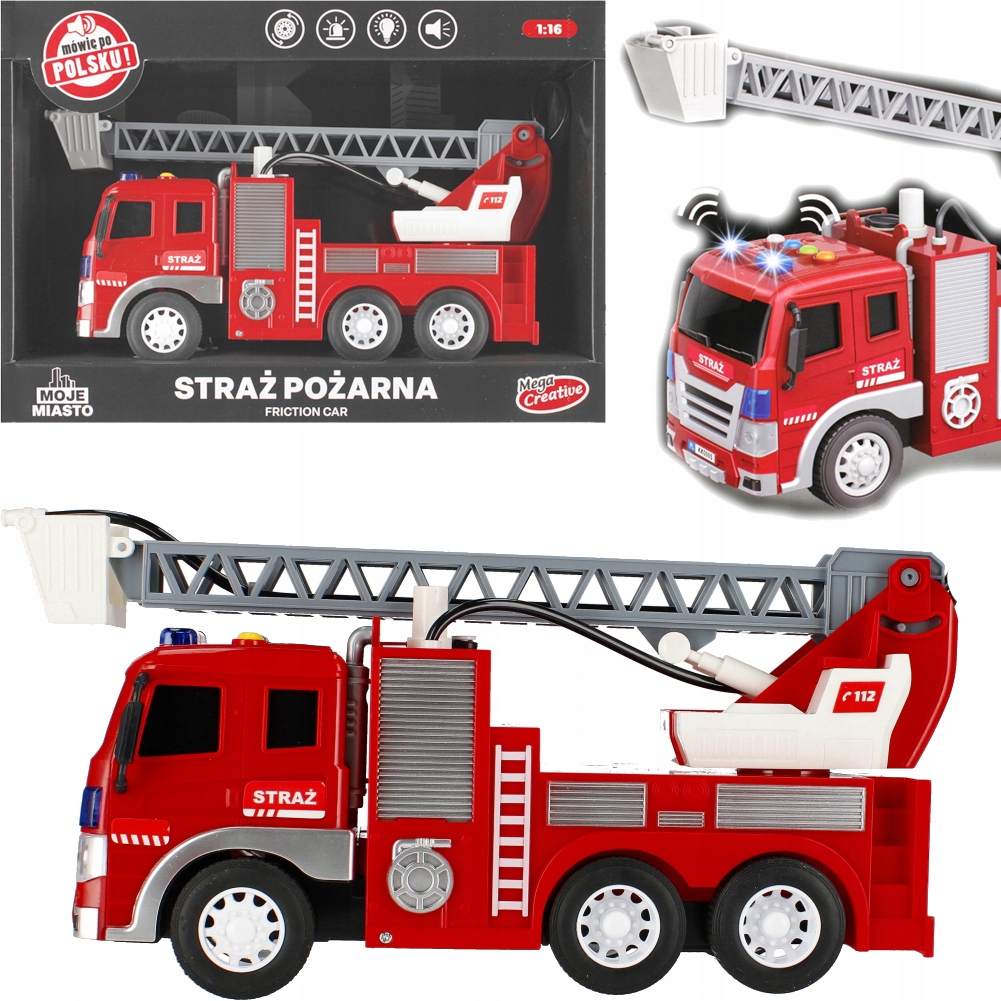 Переваги продукту: у вантажівки є функція відкату, тому після штовхання автомобіля вперед я продовжую рух самостійно, автомобіль має пересувну та висувну драбину, після наповнення відповідної ємності водою зі шланга вода б’є, транспортний засіб має багато рухомих елементів та світлові та звукові ефекти: