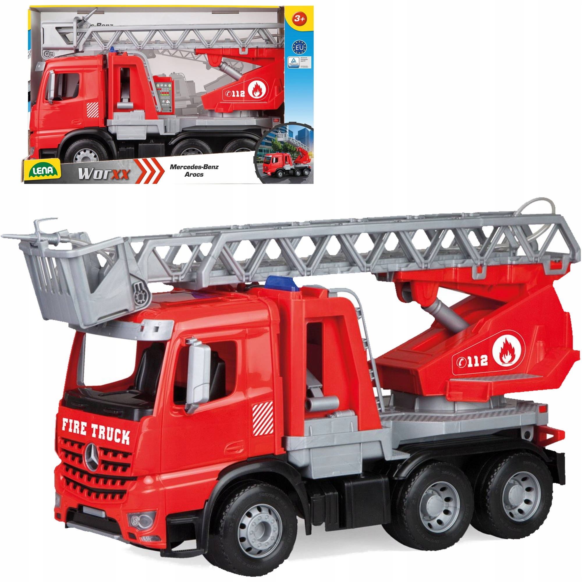 Пожежний Mercedes Arocs. Металеві осі товщиною 6 мм на колесах. Функціональний пожежний шприц з розпилювачем до 3м. Вбудований контейнер для подачі води на 250 мл. Можливість повороту на 270 градусів за допомогою драбини. Подовжувач драбини 60см