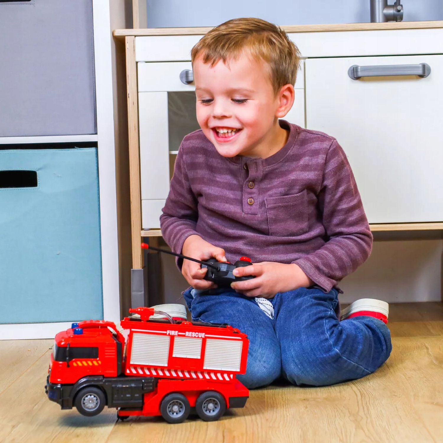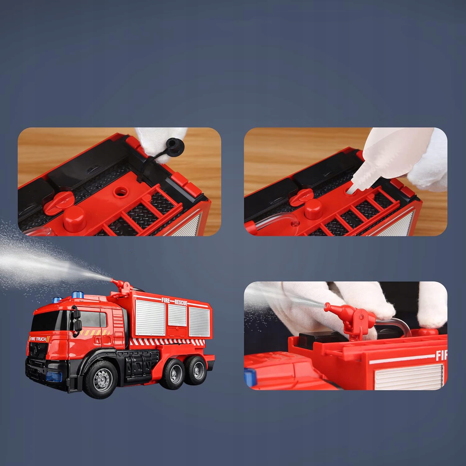 Справжня, функціональна іграшкова пожежна машина має світлодіодні фари та розпилює воду одним натисканням кнопки. Переведіть перемикач у третє положення, щоб активувати режим швидкої допомоги, що супроводжується реалістичними звуковими ефектами.