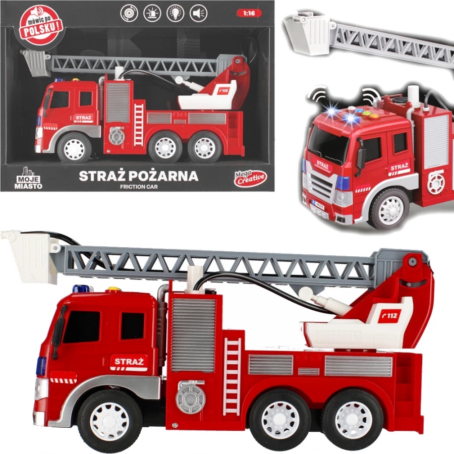переваги продукту: візок має функцію відключення, так що після натискання транспортного засобу я продовжую їздити поодинці, Автомобіль має рухомі та висувні драбини, після завершення відповідної ємності водою з зміїної води бризкає, транспортний засіб має багато рухомих елементів та легких та звукових ефектів: