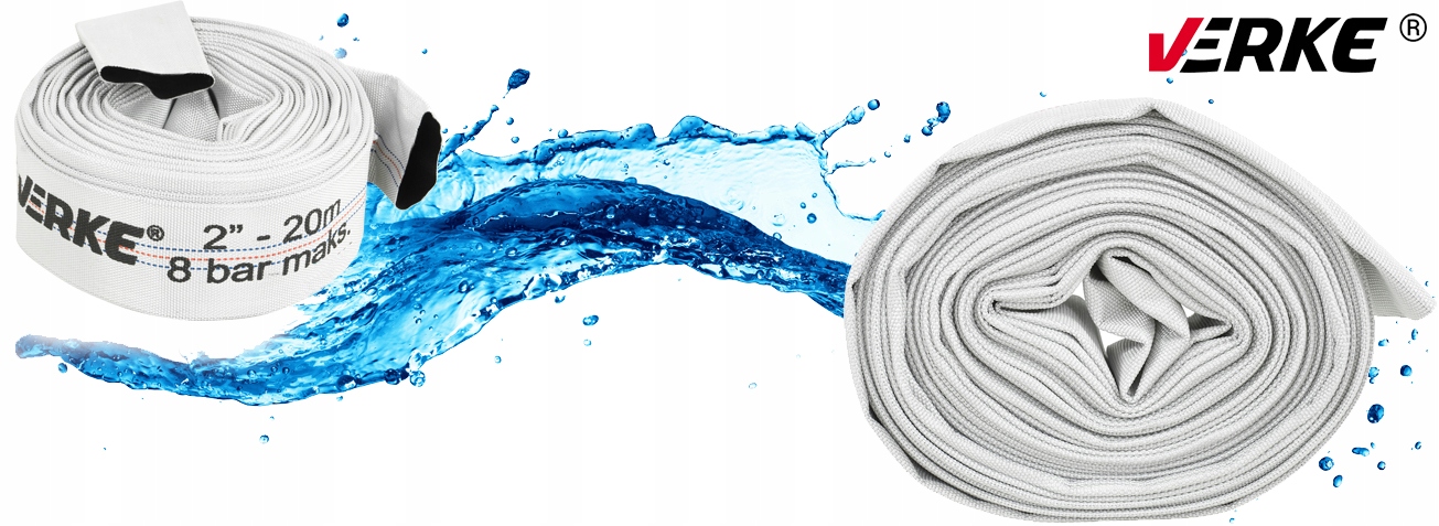 ПОЖЕЖНИЙ ШЛАНГ, Септик, 2" (52 мм) 20 метрів чистої або забрудненої води VERKE. Виготовлений з білої поліестерової стрічки в поєднанні з чорною внутрішньою вставкою. Ці шланги характеризуються високою стійкістю до перепадів температур і ідеально підходять для робота над згинами.