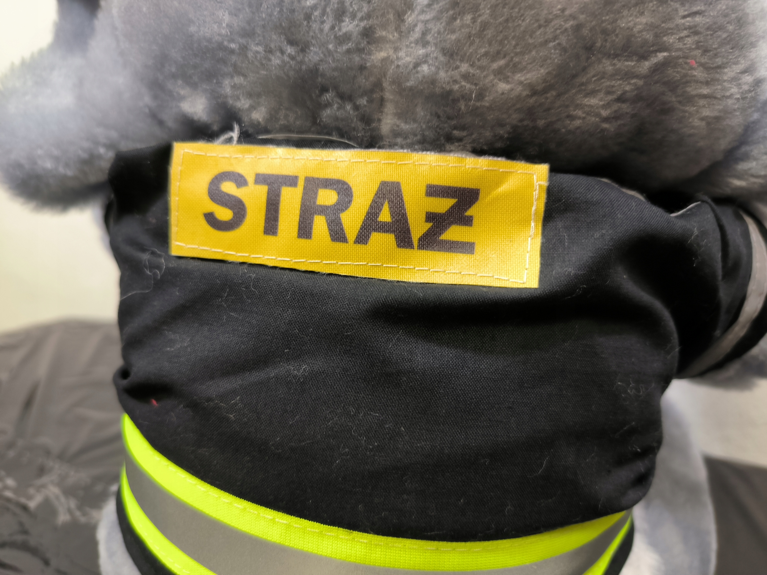 Талісман з м'якого та приємного матеріалу. Має костюм, що імітує спецодяг пожежника. Напис STRAŻ спереду та ззаду на одязі.