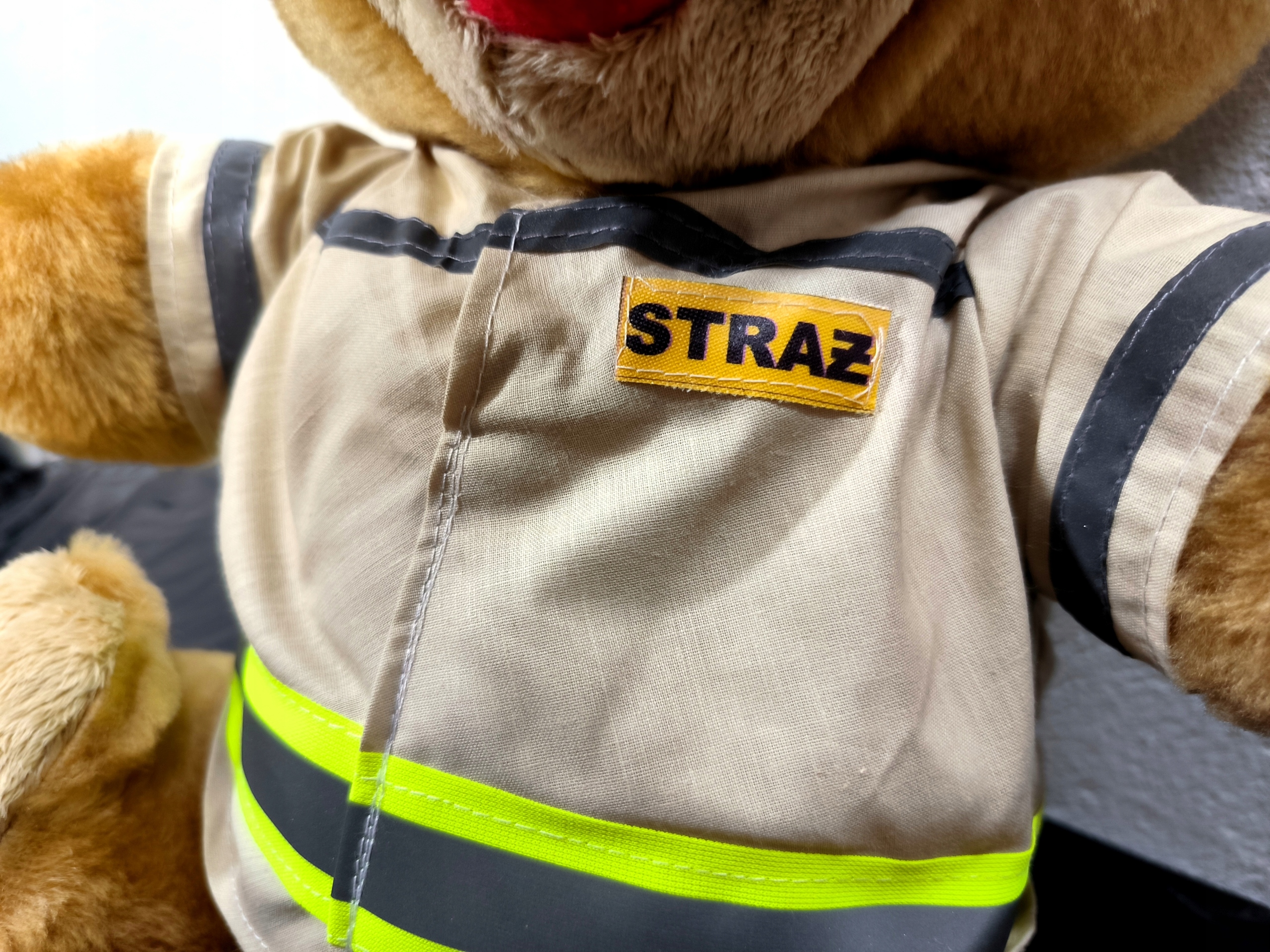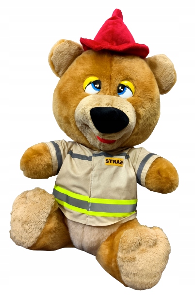 Талісман з м'якого та приємного матеріалу. Має костюм, що імітує спецодяг пожежника. Напис STRAŻ спереду та ззаду на одязі.
