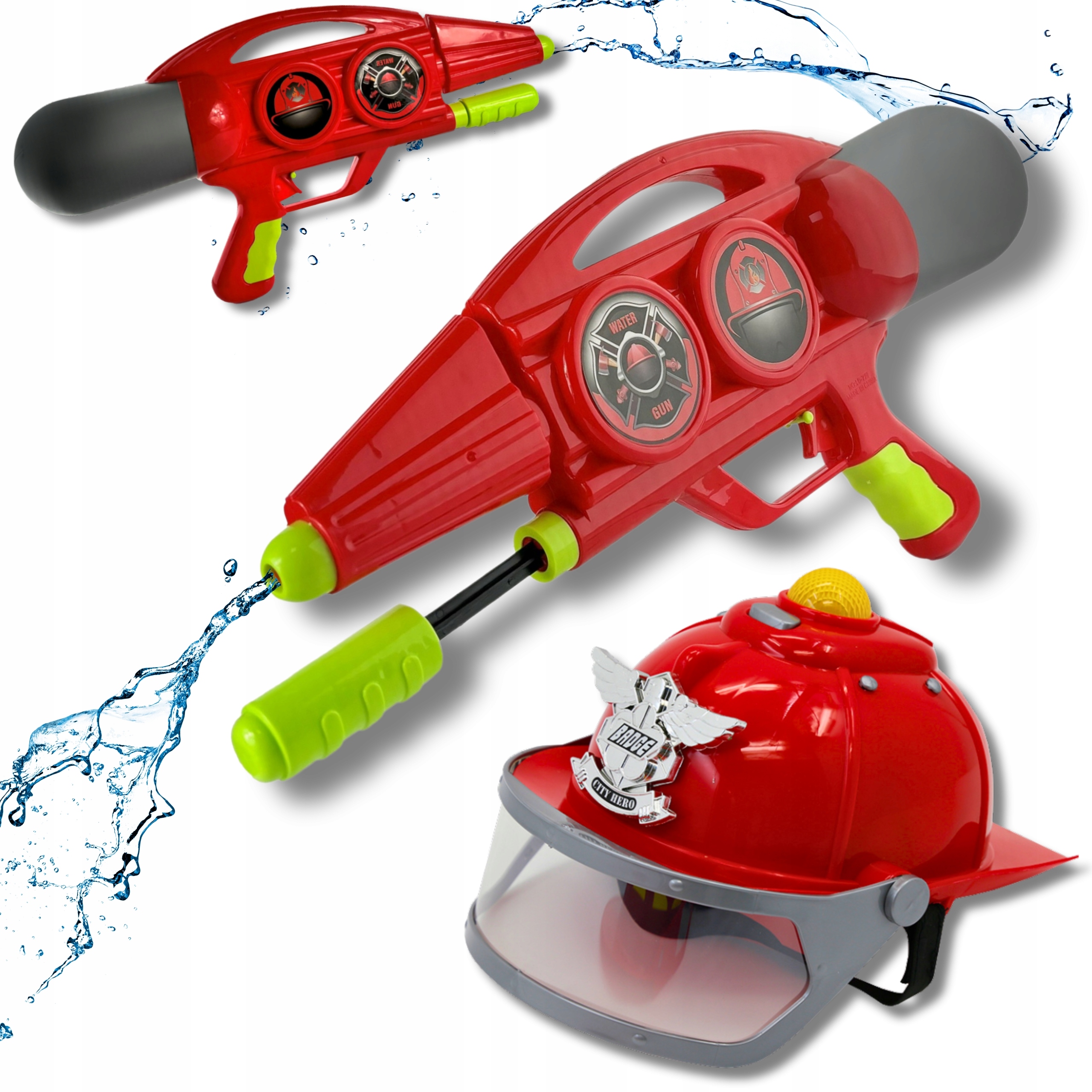 кожна дитина мріє стати героєм! Завдяки нашому пожежному набору, який містить пожежний шолом та водяний пістолет , малюк може зіграти роль відважного пожежника та пережити незабутні пригоди. Ідеально підходить для гри в саду, на пляжі, під час śmigus dyngus, а також як частина маскування пожежника.