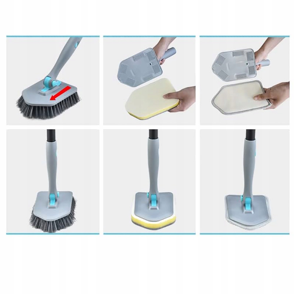 ➡4 Замінні багатофункціональні головки пензля: Вичісна щітка з висувною довгою ручкою оснащена трьома різними щітками. Жорстка щітка щетини видаляє стійкі плями; Вичісування колодки очищає ванну; Мікрофібриста прокладка копіюється з чутливими поверхнями