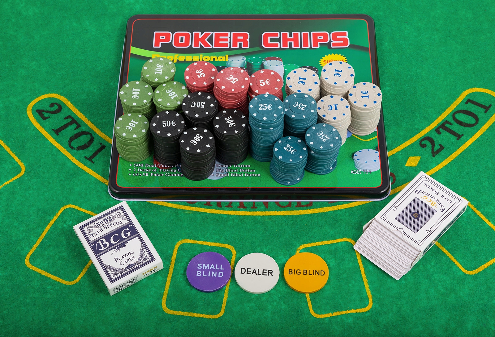 - 500 проф. , стійкі до стирання жетони з вагою, подібною до тієї, що є в казино, у кольорах 100 x чорний (50 €), синій (25 €), зелений (10 €), червоний (5 €) і білий (1 €)