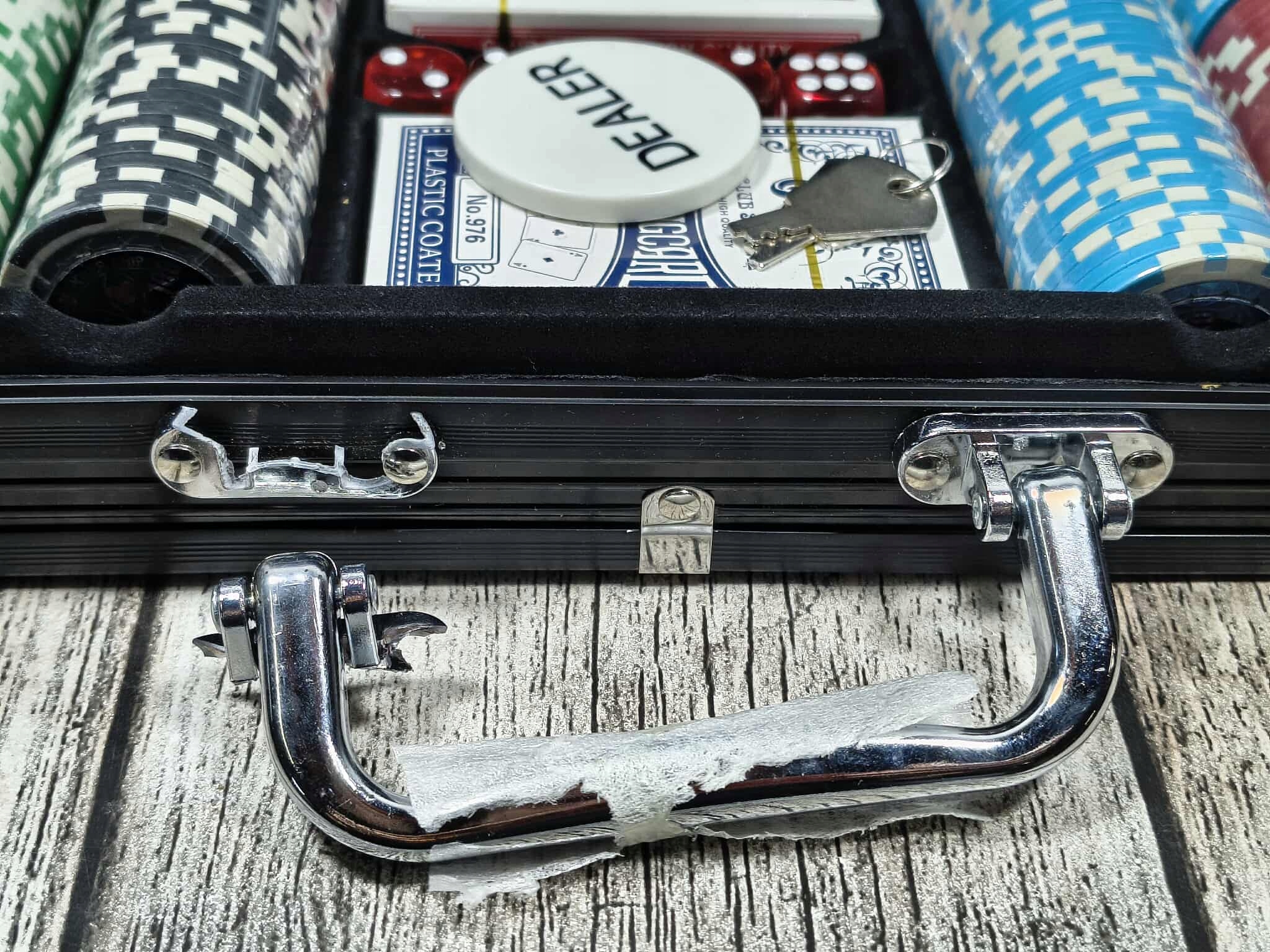 ⭐АЛЮМІНІЄВИЙ КОРПУС, ЩО ЗАМИКАЄТЬСЯ. Високоякісний алюмінієвий корпус, який замикається, забезпечує безпечне зберігання та захищає жетони та аксесуари від пошкодження — ідеально підходить для подорожей і турнірів.