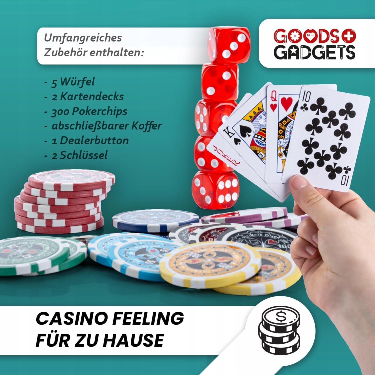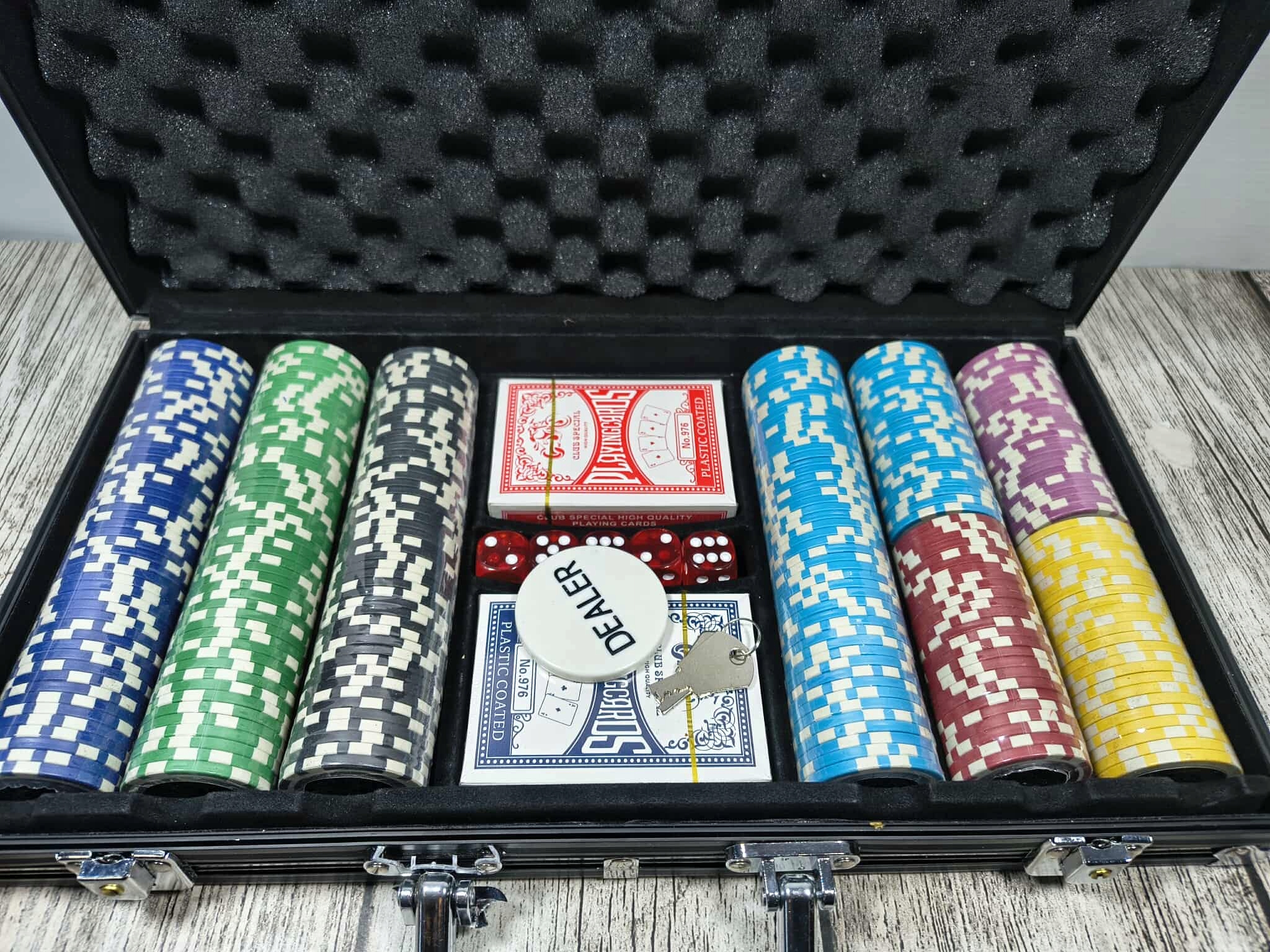 ⭐ПОВНИЙ НАБІР ДЛЯ ПОКЕРУ З АКСЕСУАРАМИ - У набір входить усе необхідне для справжньої гри в покер: 300 фішок, 2 колоди карт, 5 кубиків, жетон дилера та 2 ключі - як у справжньому казино!