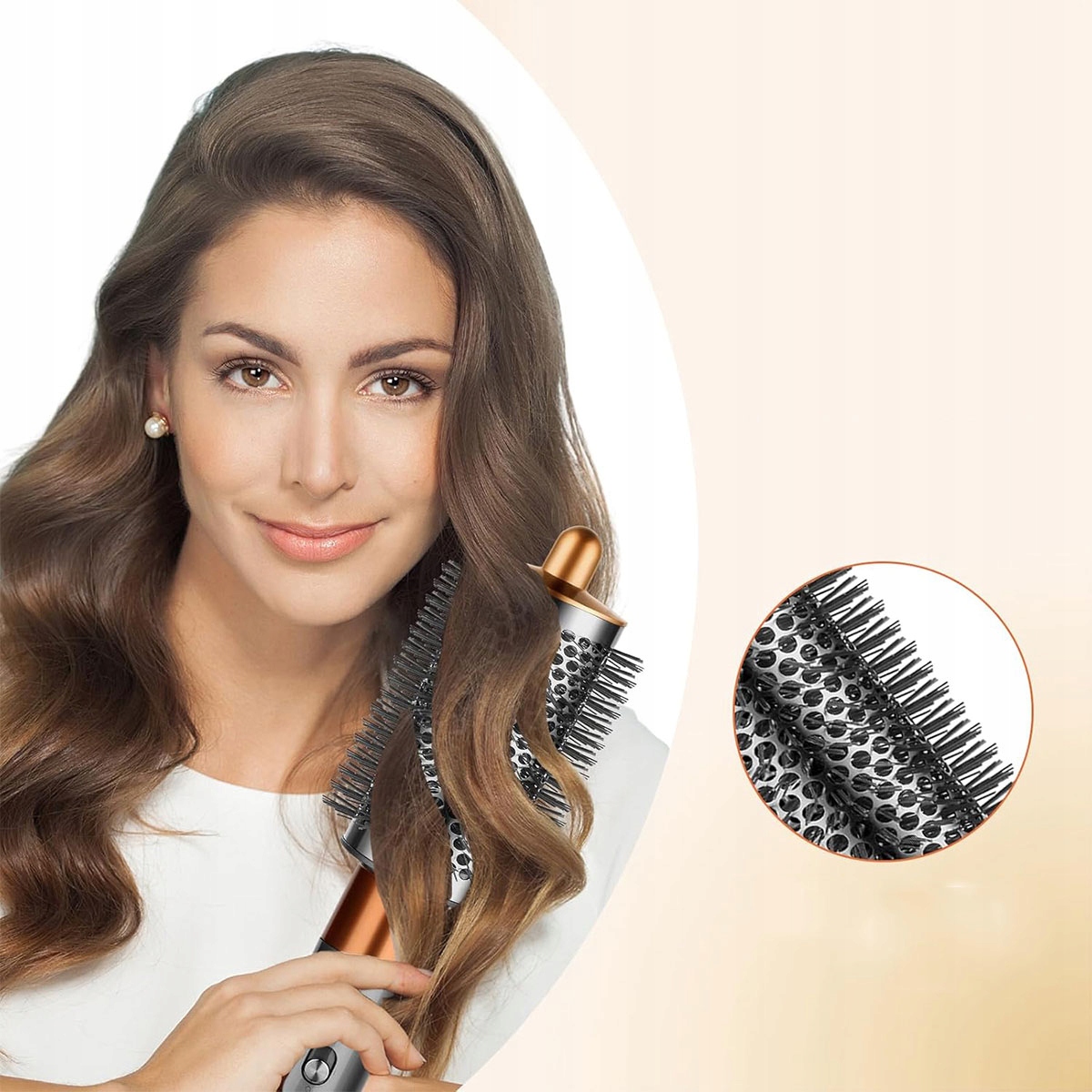 Великий круглий пензель додає об'єм, виготовлена з якісних і міцних матеріалів (нейлон + скловолокно), сіро-золотий. Гребінець має застібку з пряжкою і легко встановлюється. Після кріплення на плойку вона є більш стабільний і надійний.