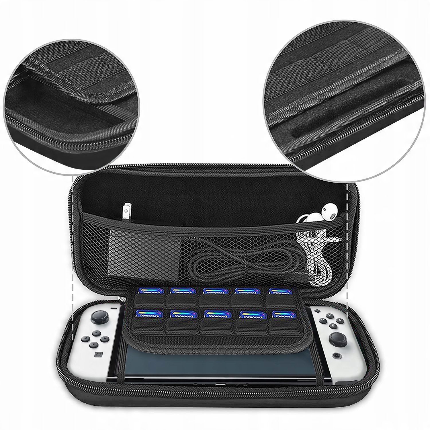 Чохол ідеально підходить для вашої консолі Nintendo Switch OLED - він ідеально захищає її. Всередині є спеціальні відділення для 10 ігрових картриджів. У верхній частині чохла є спеціальне місце для зберігання аксесуарів консолі, таких як зарядний пристрій, павербанк, навушники, ігрові бокси тощо. На чохлі також є практичний поводок для перенесення.