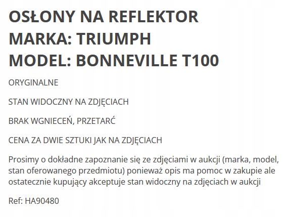 Просматривая «Лампа покрытия Triumph Bonneville T100», вы можете быть уверены, что данный товар из каталога «Обтекатели» будет доставлен из Польши и проверен на целостность. В цене товара, указанной на сайте, учтена доставка из Польши. Внимание!!! Товары для Евросоюза, согласно законодательству стран Евросоюза, могут отличаться упаковкой или наполнением.