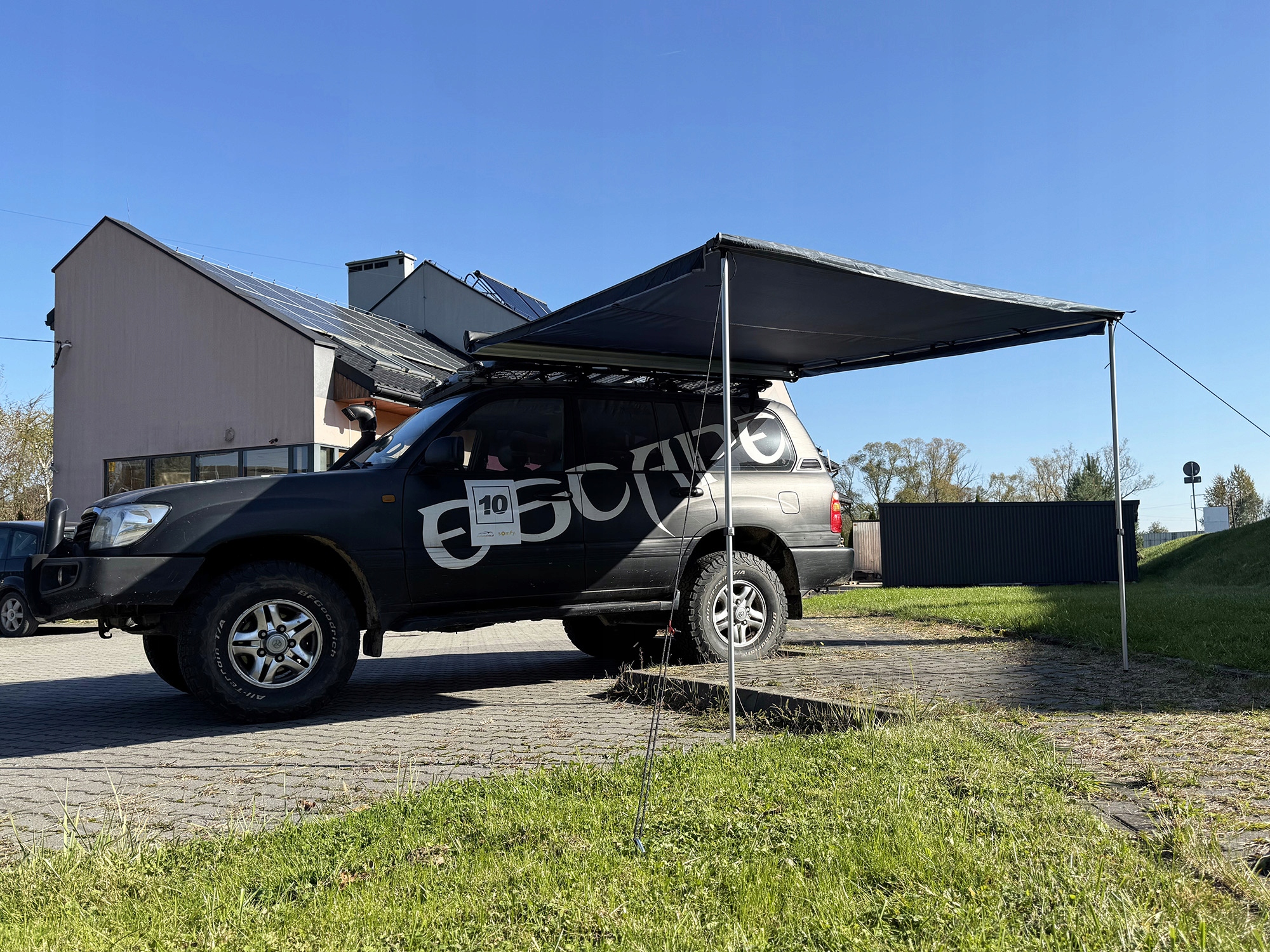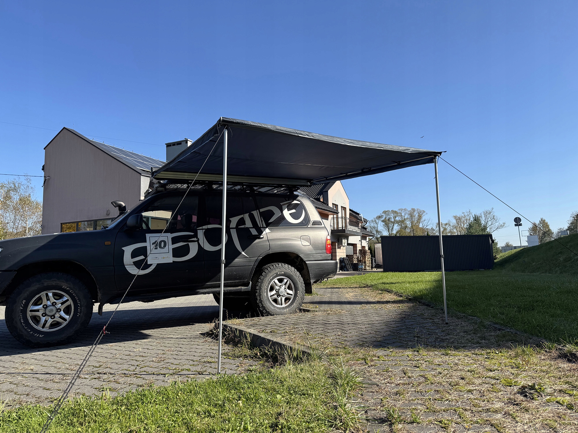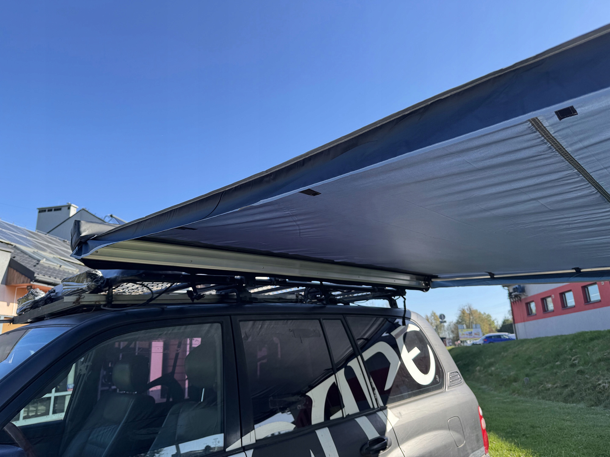 Навіс кріпиться до багажника або балки на рейлінгах. У набір входять рулонні штори, монтажні кронштейни, відтяжки та кришка.