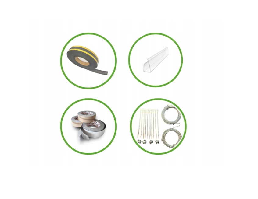 Заохочуємо придбати набір для захисту полікарбонату, до складу якого входять наступні елементи: U-образні профілі, паропроникна стрічка, ізоляційна стрічка та набір для підв’язування рослин
