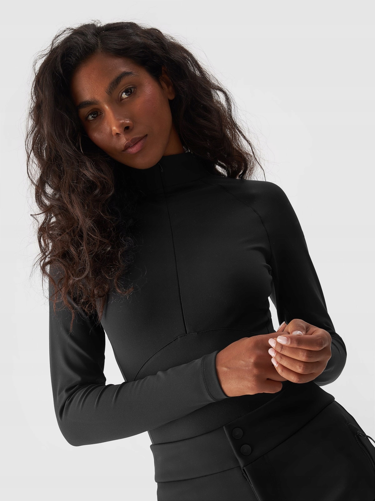 Жіночі боді з довгими рукавами з швидковисихаючих волокон за технологією 4FDry, які сприяють відведенню вологи від шкіри. тіло. Горловина з коміром-стійкою, що застібається на блискавку. Зручне 3-ступінчасте застібання на кнопки.