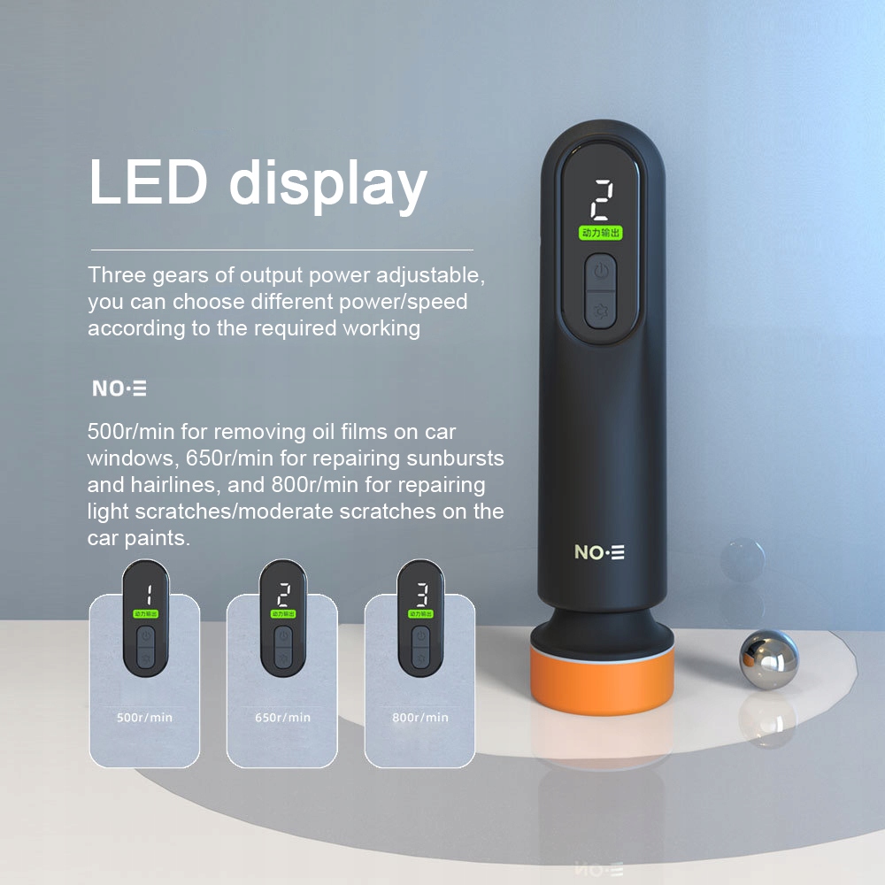 Світлодіодний дисплей, три регульовані джерела живлення, ви можете вибрати різну потужність/швидкість відповідно до ваших умов роботи. 500 об/хв /хв для видалення масляних відкладень зі стекол автомобіля, 650 об/хв. /хв для ремонту захисних мікросхем і волосків і 800 об./хв. /хв для ремонту легких і стійких подряпин на фарбі автомобіля.